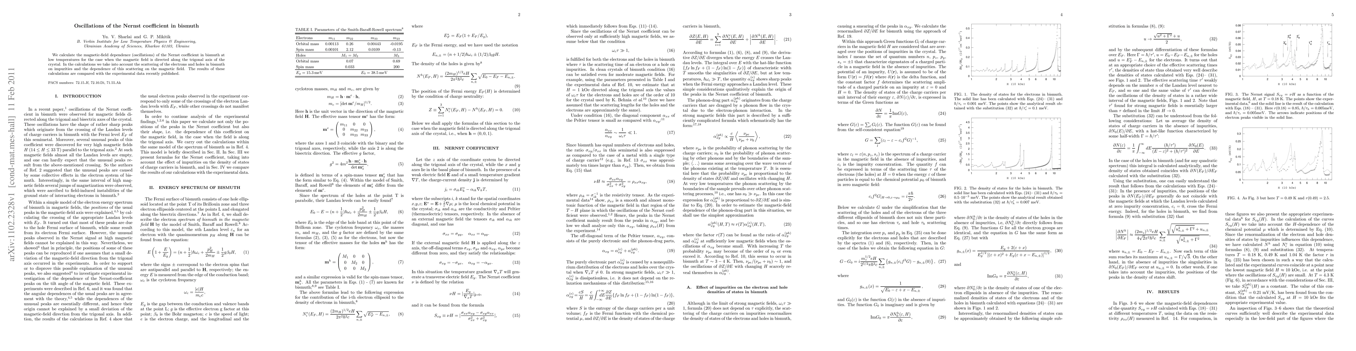 This paper investigates the magnetic-field-induced oscillations in the Nernst coefficient of bismuth at low temperatures, considering electron and hole scattering on impurities. The calculated results are compared with recent experimental data, providing insights into the material's thermoelectric properties.