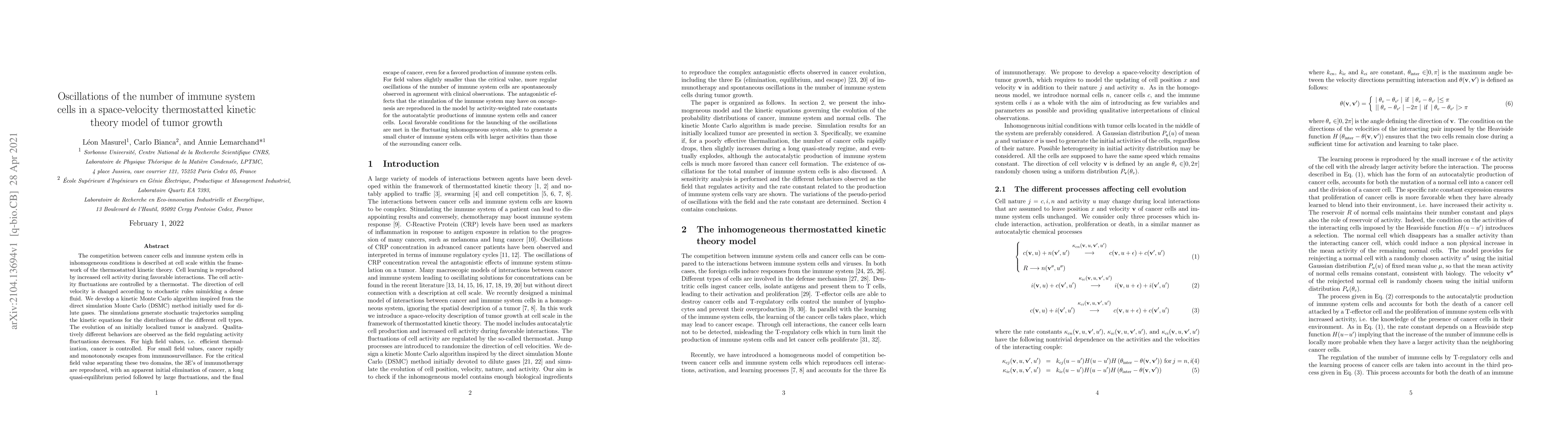 The competition between cancer cells and immune system cells in inhomogeneous conditions is described at cell scale within the framework of the thermostatted kinetic theory. Cell learning is reproduced by increased cell activity during favorable interactions. The cell activity fluctuations are controlled by a thermostat. The direction of cell velocity is changed according to stochastic rules mimicking a dense fluid. We develop a kinetic Monte Carlo algorithm inspired from the direct simulation Monte Carlo (DSMC) method initially used for dilute gases. The evolution of an initially localized tumor is analyzed. Qualitatively different behaviors are observed as the field regulating activity fluctuations decreases. For high field values, i.e. efficient thermalization, cancer is controlled. For small field values, cancer rapidly and monotonously escapes from immunosurveillance. For the critical field value separating these two domains, the 3E's of immunotherapy are reproduced, with an apparent initial elimination of cancer, a long quasi-equilibrium period followed by large fluctuations, and the final escape of cancer, even for a favored production of immune system cells. For field values slightly smaller than the critical value, more regular oscillations of the number of immune system cells are spontaneously observed in agreement with clinical observations. The antagonistic effects that the stimulation of the immune system may have on oncogenesis are reproduced in the model by activity-weighted rate constants for the autocatalytic productions of immune system cells and cancer cells. Local favorable conditions for the launching of the oscillations are met in the fluctuating inhomogeneous system, able to generate a small cluster of immune system cells with larger activities than those of the surrounding cancer cells.
