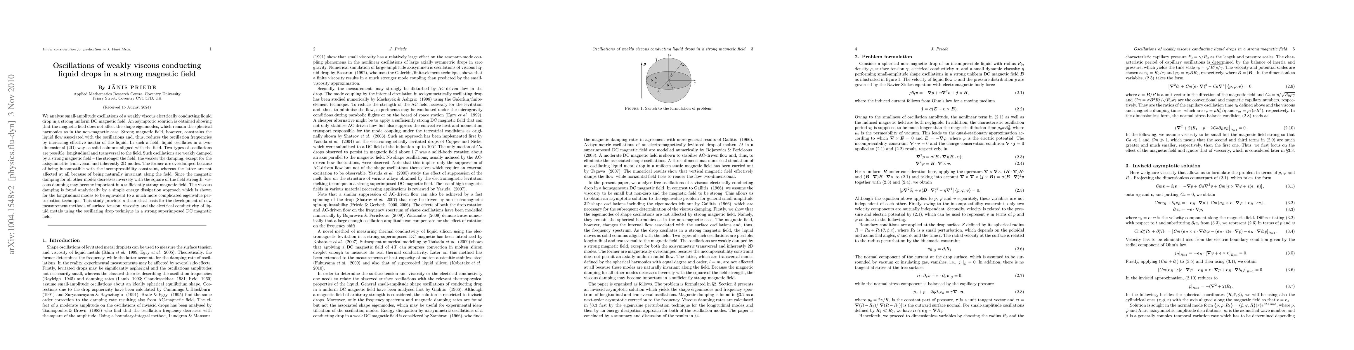 We analyse small-amplitude oscillations of a weakly viscous electrically conducting liquid drop in a strong uniform DC magnetic field. An asymptotic solution is obtained showing that the magnetic field does not affect the shape eigenmodes, which remain the spherical harmonics as in the non-magnetic case. Strong magnetic field, however, constrains the liquid flow associated with the oscillations and, thus, reduces the oscillation frequencies by increasing effective inertia of the liquid. In such a field, liquid oscillates in a two-dimensional (2D) way as solid columns aligned with the field. Two types of oscillations are possible: longitudinal and transversal to the field. Such oscillations are weakly damped by a strong magnetic field - the stronger the field, the weaker the damping, except for the axisymmetric transversal and inherently 2D modes. The former are overdamped because of being incompatible with the incompressibility constraint, whereas the latter are not affected at all because of being naturally invariant along the field. Since the magnetic damping for all other modes decreases inversely with the square of the field strength, viscous damping may become important in a sufficiently strong magnetic field. The viscous damping is found analytically by a simple energy dissipation approach which is shown for the longitudinal modes to be equivalent to a much more complicated eigenvalue perturbation technique. This study provides a theoretical basis for the development of new measurement methods of surface tension, viscosity and the electrical conductivity of liquid metals using the oscillating drop technique in a strong superimposed DC magnetic field.