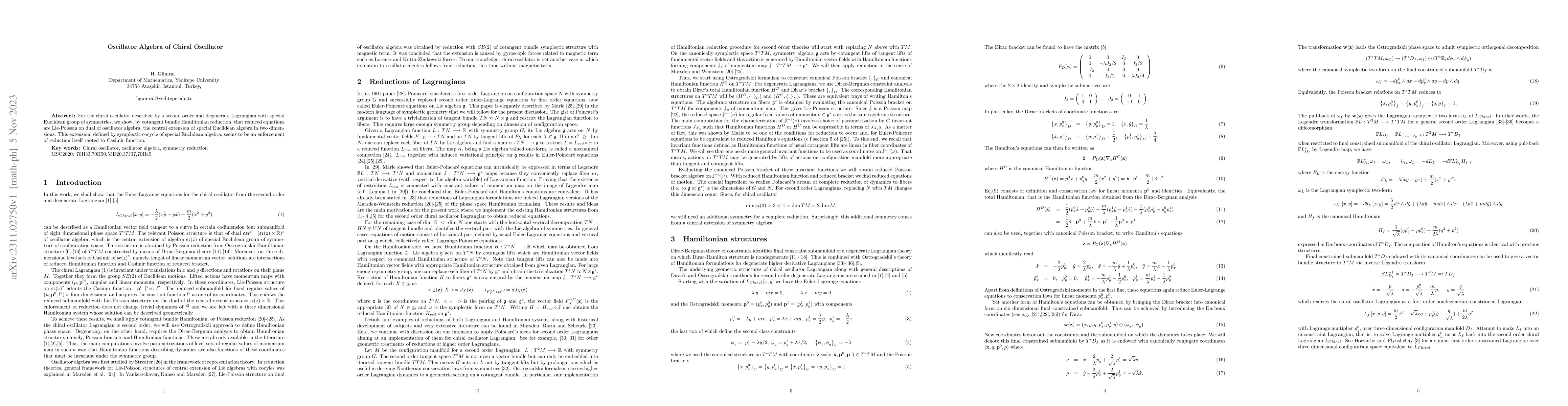 The research demonstrates that the chiral oscillator's reduced equations, derived via Hamiltonian reduction, exhibit Lie-Poisson dynamics on the dual of the oscillator algebra, which is a central extension of the special Euclidean algebra in two dimensions. This extension is linked to the symplectic two-cocycle of the special Euclidean algebra and appears to be intrinsically tied to the Casimir function.
