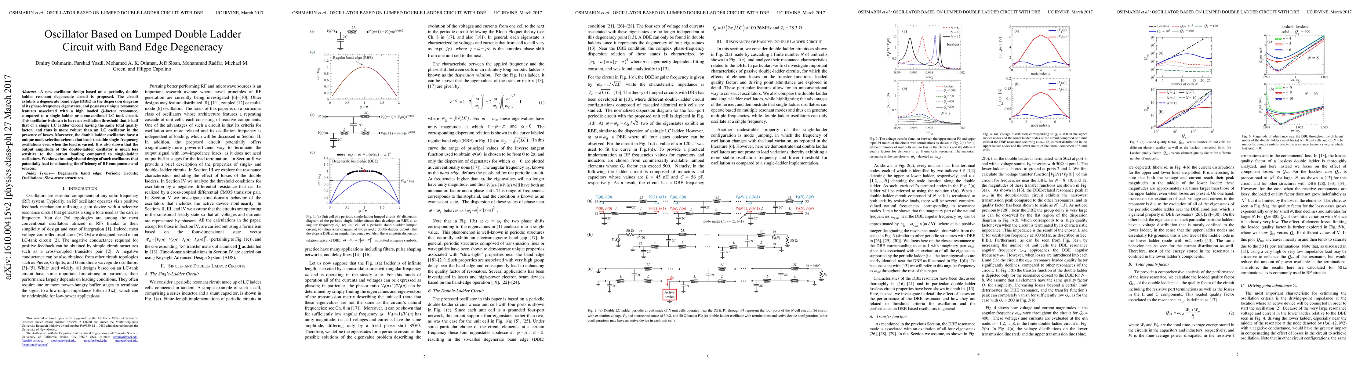 An oscillator design based on a periodic, double ladder resonant circuit is proposed. The circuit exhibits a degenerate band edge (DBE) in the dispersion diagram of its phase-frequency eigenstates, and possesses unique resonance features associated with a high Q-factor resonance, compared to a single ladder or a conventional LC tank circuit. This oscillator is shown to have an oscillation threshold that is half that of a single LC ladder circuit having the same total quality factor, and thus is more robust than an LC oscillator in the presence of losses. It is also shown that the output and amplitude of the double-ladder oscillator is much less sensitive to the output loading compared to single-ladder oscillators. We show the analysis and design of such oscillators that potentially lead to enhancing the efficiency of RF components and sources.