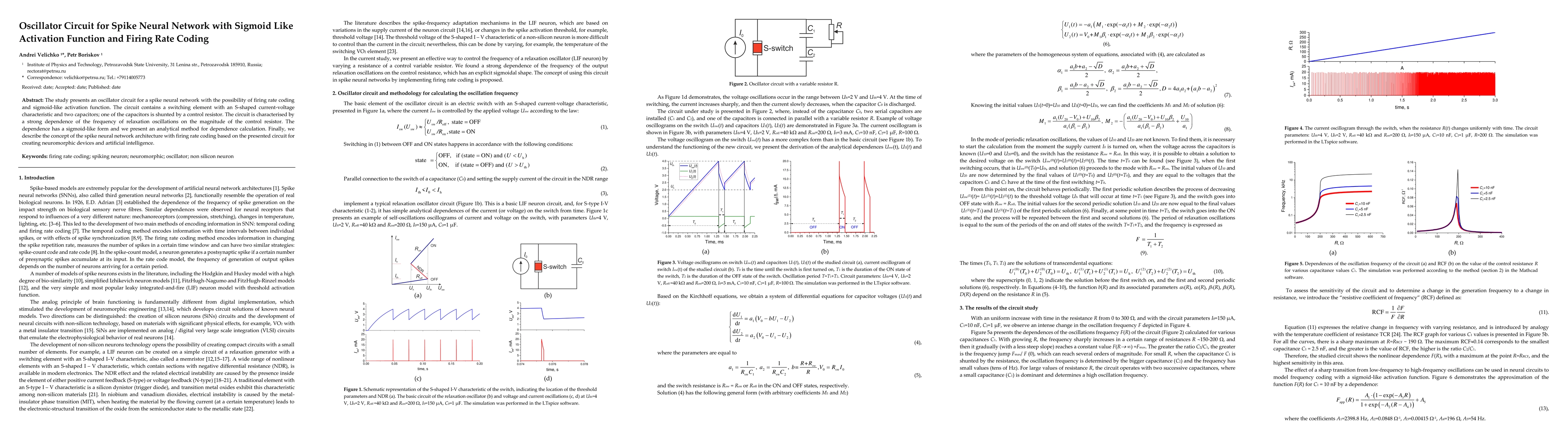 This paper introduces an oscillator circuit for spike neural networks that supports firing rate coding and a sigmoid-like activation function. The circuit features a switching element with an S-shaped current-voltage characteristic and a control resistor that determines the sigmoid-like frequency dependence of relaxation oscillations, enabling neuromorphic devices and AI applications.