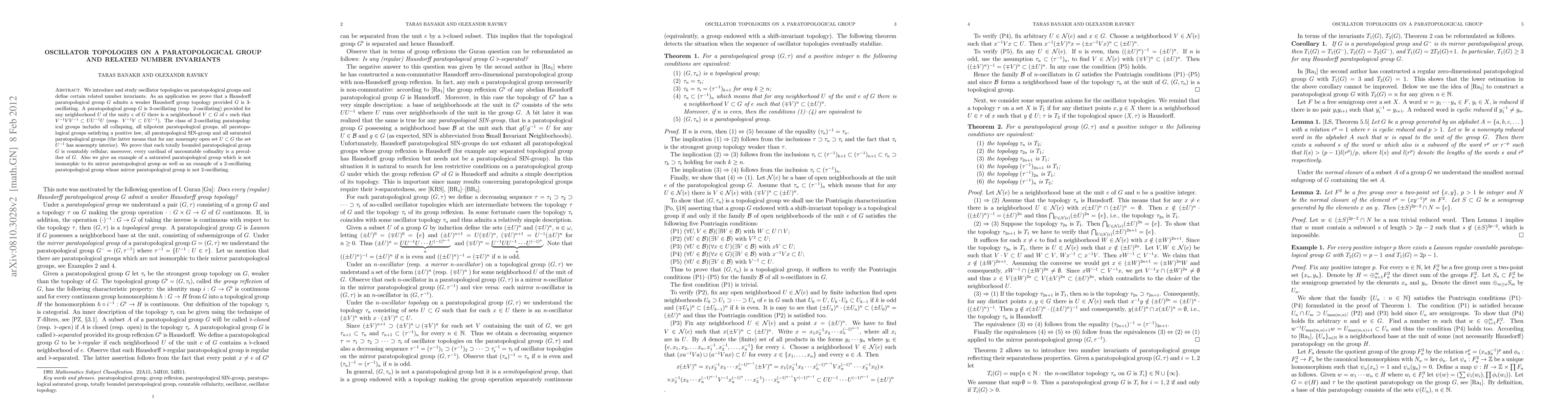 We introduce and study oscillator topologies on paratopological groups and define certain related number invariants. As an application we prove that a Hausdorff paratopological group $G$ admits a weaker Hausdorff group topology provided $G$ is 3-oscillating. A paratopological group $G$ is 3-oscillating (resp. 2-oscillating) provided for any neighborhood $U$ of the unity $e$ of $G$ there is a neighborhood $V\subset G$ of $e$ such that $V^{-1}VV^{-1}\subset UU^{-1}U$ (resp. $V^{-1}V\subset UU^{-1}$). The class of 2-oscillating paratopological groups includes all collapsing, all nilpotent paratopological groups, all paratopological groups satisfying a positive law, all paratopological SIN-group and all saturated paratopological groups (the latter means that for any nonempty open set $U\subset G$ the set $U^{-1}$ has nonempty interior). We prove that each totally bounded paratopological group $G$ is countably cellular; moreover, every cardinal of uncountable cofinality is a precaliber of $G$. Also we give an example of a saturated paratopological group which is not isomorphic to its mirror paratopological group as well as an example of a 2-oscillating paratopological group whose mirror paratopological group is not 2-oscillating.