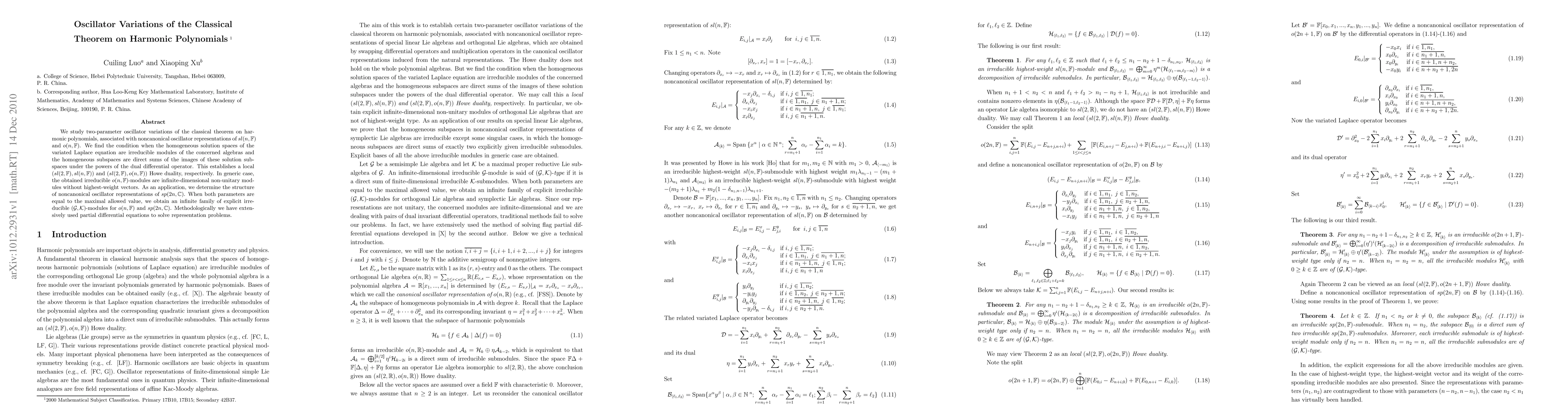 This paper investigates two-parameter oscillator variations of the classical theorem on harmonic polynomials, establishing local Howe duality for (sl(2),sl(n)) and (sl(2),o(n)) pairs. It finds conditions for irreducible solution spaces of the variated Laplace equation and determines the structure of noncanonical oscillator representations of sp(2n), yielding infinite families of irreducible (G,K)-modules for o(n) and sp(2n) when parameters reach their maximal values.