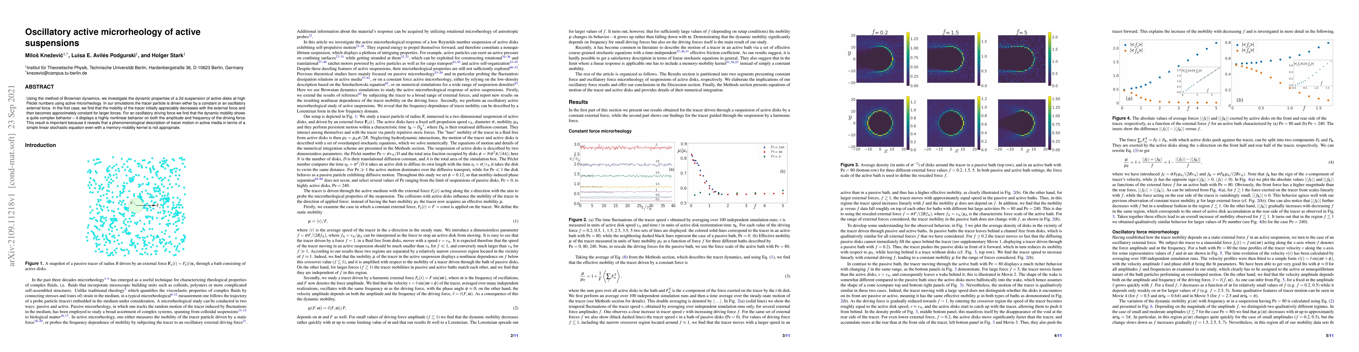 The study investigates the dynamic properties of a 2D suspension of active disks at high Péclet numbers using active microrheology. Simulations employ Brownian dynamics with a tracer particle driven by either a constant or oscillatory external force.