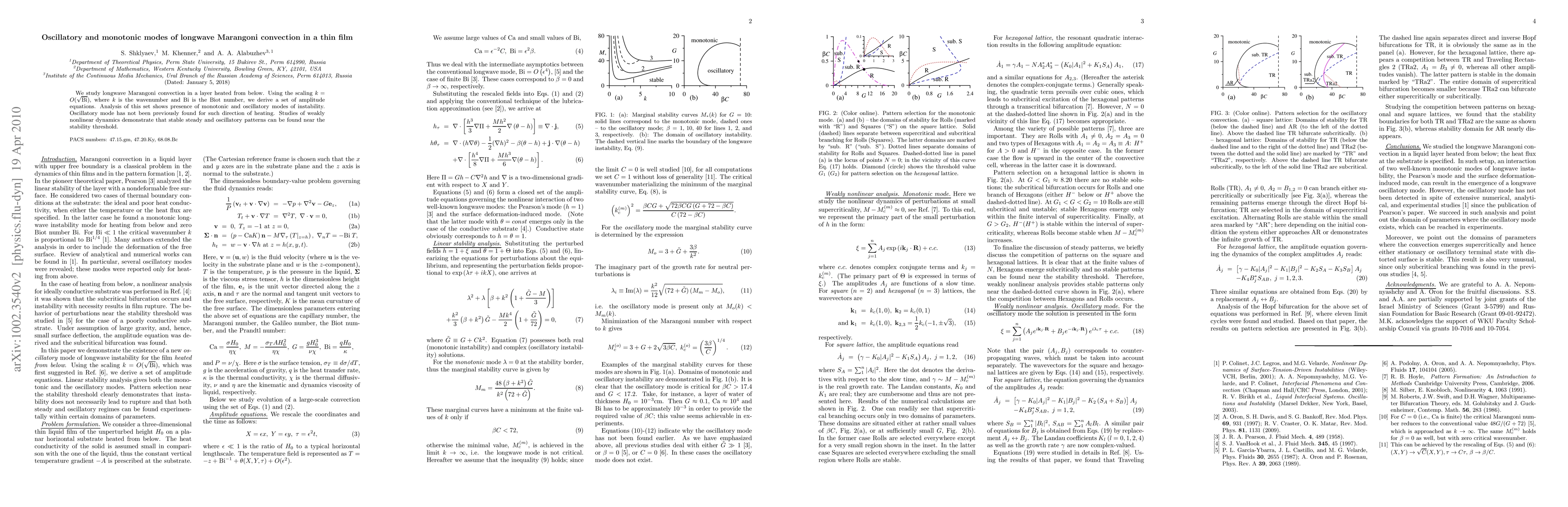 This paper investigates longwave Marangoni convection in a heated thin film layer, revealing both monotonic and oscillatory instability modes using a scaling approach. Notably, the oscillatory mode, previously unreported for this heating direction, is found alongside stable steady patterns near the stability threshold.