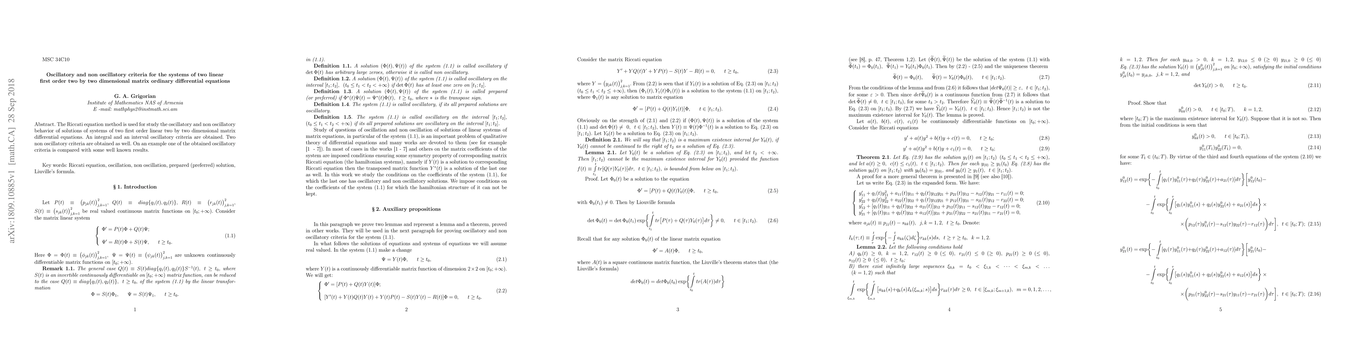 The Riccati equation method is used for study the oscillatory and non oscillatory behavior of solutions of systems of two first order linear two by two dimensional matrix differential equations. An integral and an interval oscillatory criteria are obtained. Two non oscillatory criteria are obtained as well. On an example one of the obtained oscillatory criteria is compared with some well known results.