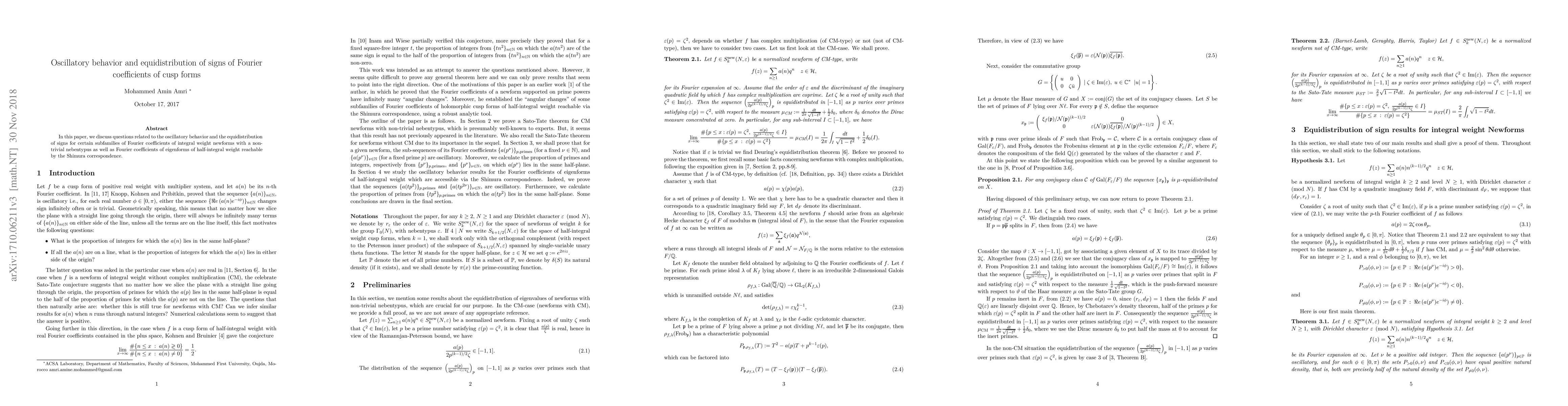 In this paper, we discuss questions related to the oscillatory behavior and the equidistribution of signs for certain subfamilies of Fourier coefficients of integral weight newforms with a non-trivial nebentypus as well as Fourier coefficients of eigenforms of half-integral weight reachable by the Shimura correspondence.