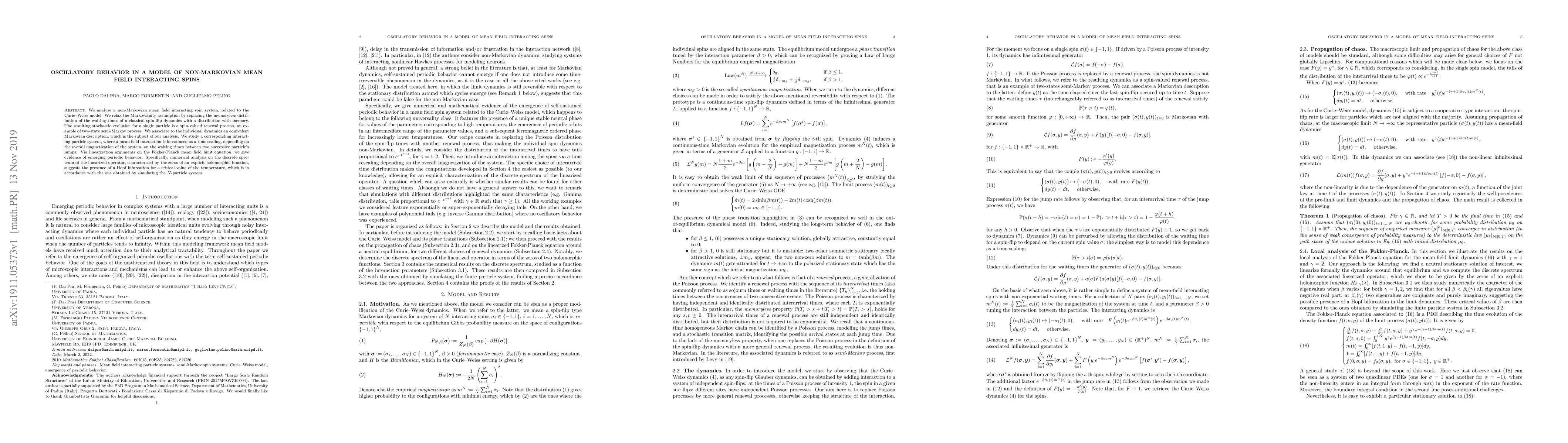 This paper investigates a non-Markovian mean field interacting spin system, revealing periodic behavior through a Hopf bifurcation at a critical temperature. The study replaces the Markovian assumption with a memory-dependent distribution, leading to a spin-valued renewal process and a corresponding Markovian description.