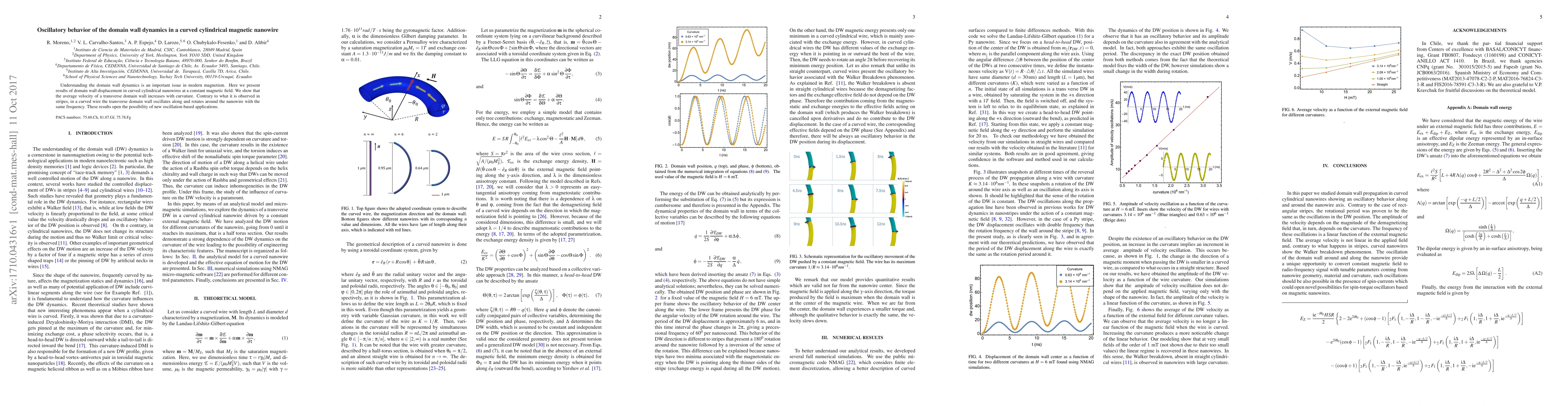 This study investigates the oscillatory behavior of transverse domain walls in curved cylindrical magnetic nanowires under a constant magnetic field. The research reveals that the domain wall velocity increases with curvature and exhibits consistent oscillation and rotation along the wire, suggesting potential for novel oscillation-based applications.