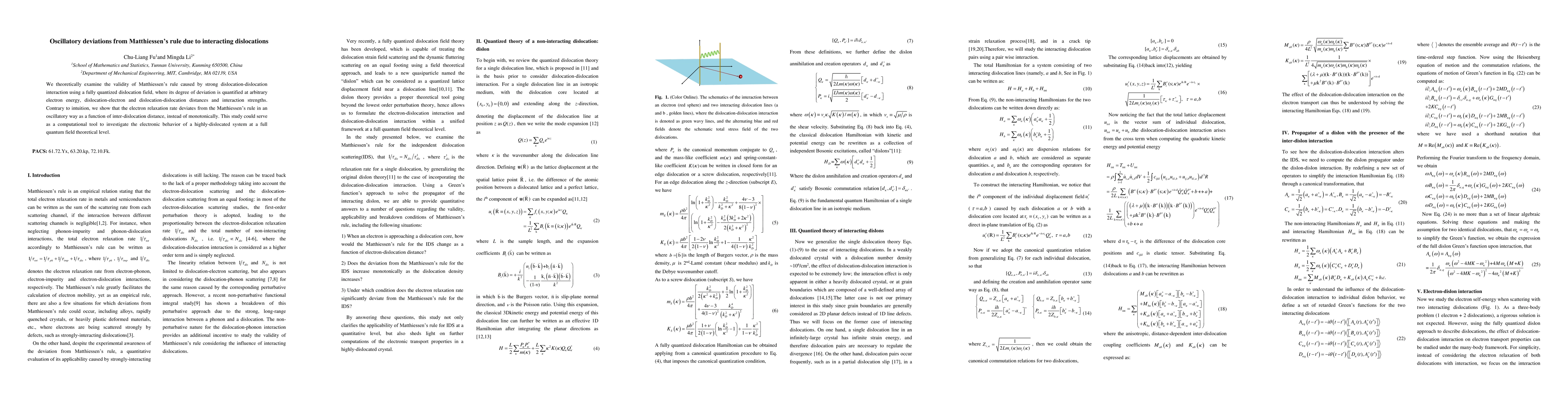 We theoretically examine the validity of Matthiessen's rule caused by strong dislocation-dislocation interaction using a fully quantized dislocation field, where its degree of deviation is quantified at arbitrary electron energy, dislocation-electron and dislocation-dislocation distances and interaction strengths. Contrary to intuition, we show that the electron relaxation rate deviates from the Matthiessen's rule in an oscillatory way as a function of inter-dislocation distance, instead of monotonically. This study could serve as a computational tool to investigate the electronic behavior of a highly-dislocated system at a full quantum field theoretical level.