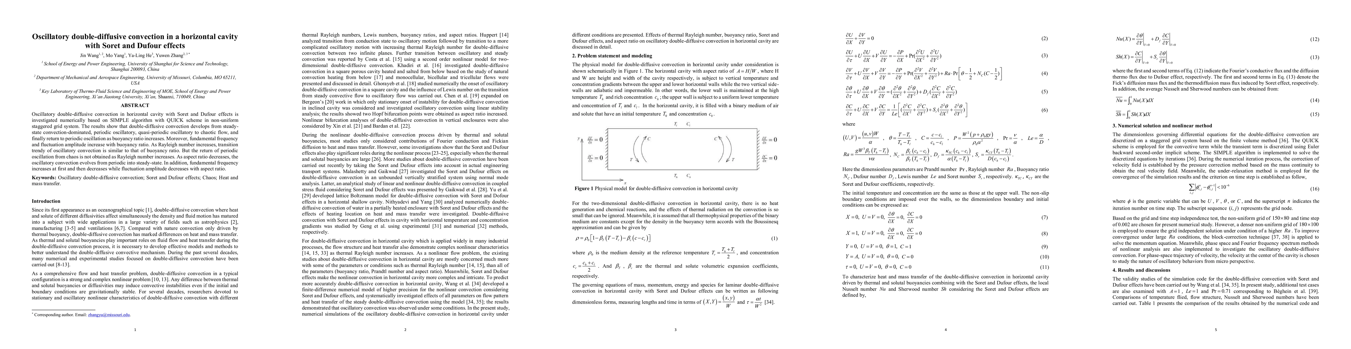 Oscillatory double-diffusive convection in horizontal cavity with Soret and Dufour effects is investigated numerically based on SIMPLE algorithm with QUICK scheme in non-uniform staggered grid system. The results show that double-diffusive convection develops from steady-state convection-dominated, periodic oscillatory, quasi-periodic oscillatory to chaotic flow, and finally return to periodic oscillation as buoyancy ratio increases. Moreover, fundamental frequency and fluctuation amplitude increase with buoyancy ratio. As Rayleigh number increases, transition trendy of oscillatory convection is similar to that of buoyancy ratio. But the return of periodic oscillation from chaos is not obtained as Rayleigh number increases. As aspect ratio decreases, the oscillatory convection evolves from periodic into steady-state. In addition, fundamental frequency increases at first and then decreases while fluctuation amplitude decreases with aspect ratio.
