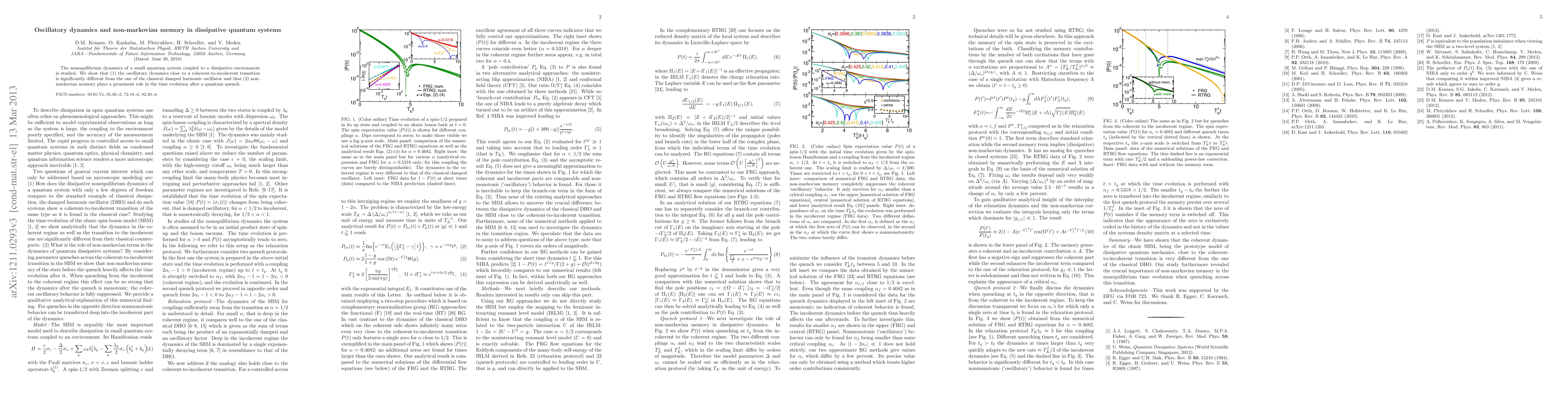 The nonequilibrium dynamics of a small quantum system coupled to a dissipative environment is studied. We show that (1) the oscillatory dynamics close to a coherent-to-incoherent transition is surprisingly different from the one of the classical damped harmonic oscillator and that (2) non-markovian memory plays a prominent role in the time evolution after a quantum quench.