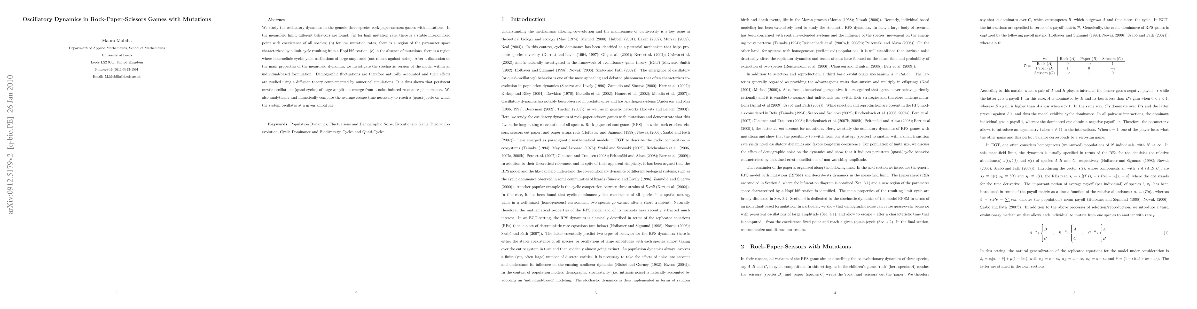 This paper investigates the oscillatory dynamics in rock-paper-scissors games with mutations, revealing stable coexistence, limit cycles, and heteroclinic cycles under varying mutation rates. It further explores stochastic effects in an individual-based model, demonstrating noise-induced quasi-cycles and calculating the average escape time to reach these oscillations.
