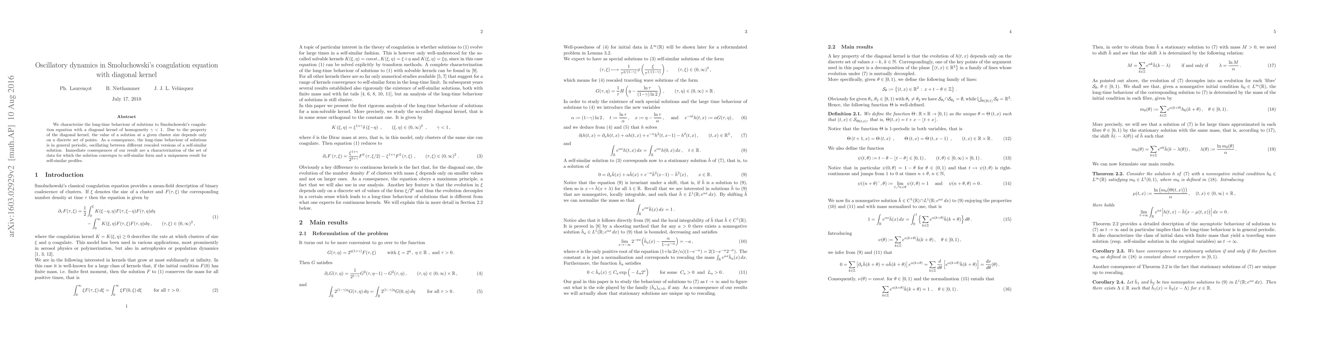 This paper investigates the long-term behavior of solutions to Smoluchowski's coagulation equation with a diagonal kernel of homogeneity less than 1, revealing periodic oscillations between rescaled self-similar solutions. It also characterizes conditions for convergence to self-similar form and establishes uniqueness of self-similar profiles.