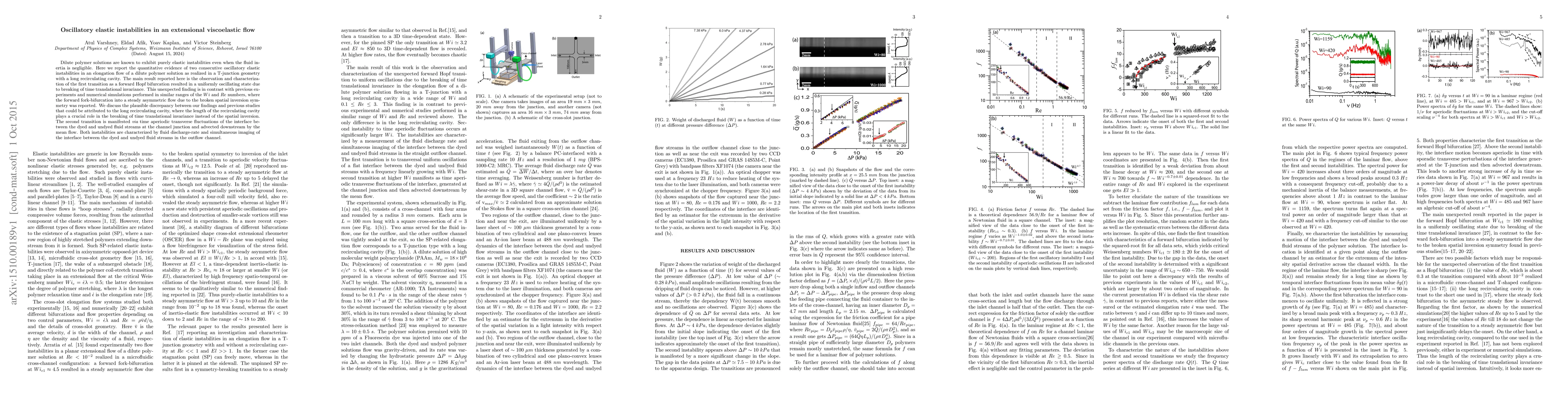 This paper reports the observation of two consecutive oscillatory elastic instabilities in a dilute polymer solution's elongation flow, characterized by a forward Hopf bifurcation leading to uniform oscillations, contrasting with previous findings of a steady asymmetric flow. The study attributes the discrepancy to the influence of a long recirculating cavity in breaking time translational invariance.