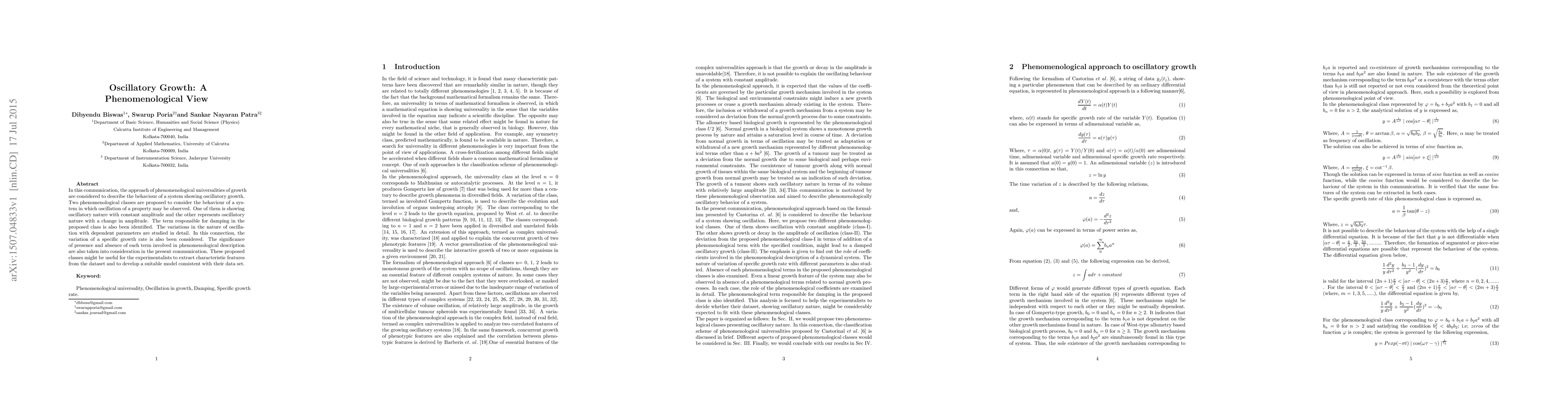 In this communication, the approach of phenomenological universalities of growth are considered to describe the behaviour of a system showing oscillatory growth. Two phenomenological classes are proposed to consider the behaviour of a system in which oscillation of a property may be observed. One of them is showing oscillatory nature with constant amplitude and the other represents oscillatory nature with a change in amplitude. The term responsible for damping in the proposed class is also been identified. The variations in the nature of oscillation with dependent parameters are studied in detail. In this connection, the variation of a specific growth rate is also been considered. The significance of presence and absence of each term involved in phenomenological description are also taken into consideration in the present communication. These proposed classes might be useful for the experimentalists to extract characteristic features from the dataset and to develop a suitable model consistent with their data set.