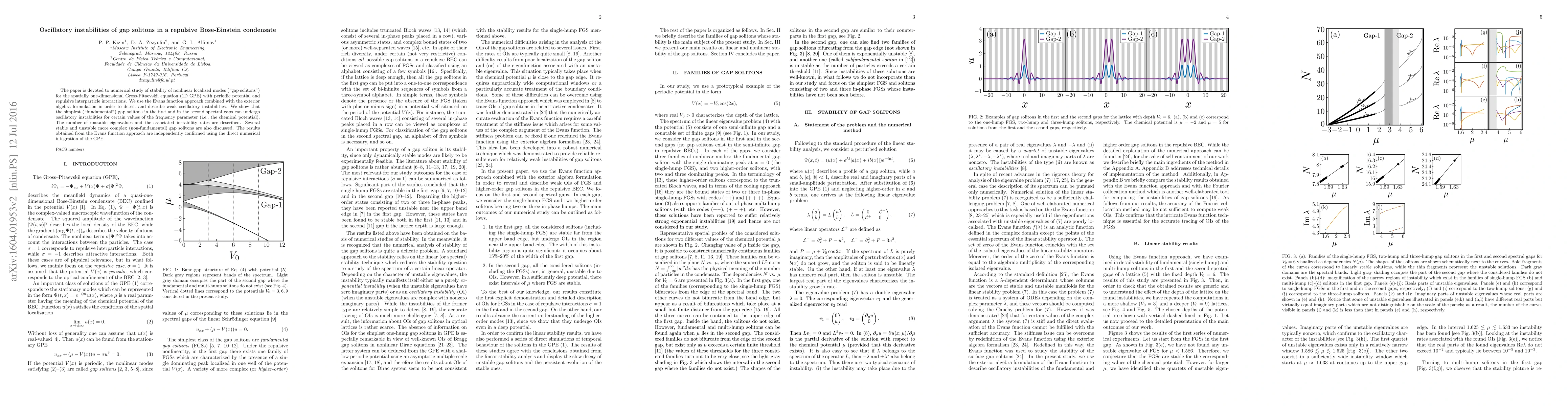 This paper investigates the stability of gap solitons in a 1D Bose-Einstein condensate using the Evans function approach and numerical integration of the Gross-Pitaevskii equation. It reveals oscillatory instabilities in fundamental gap solitons within specific frequency ranges, and discusses the stability of more complex solitons.