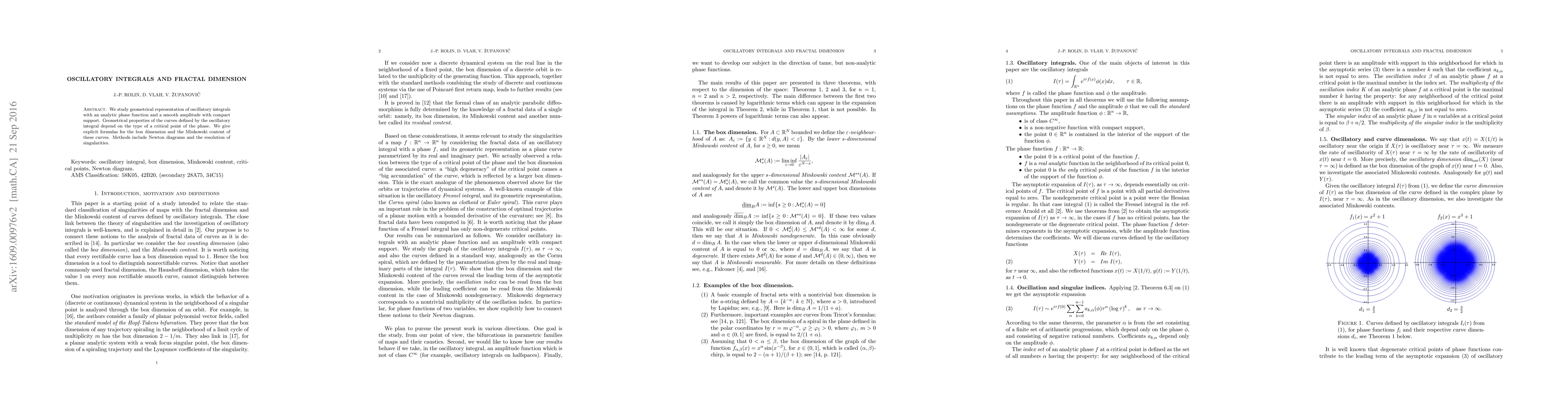 This paper investigates the geometrical representation of oscillatory integrals, focusing on the fractal dimension of curves defined by such integrals. It provides explicit formulas for the box dimension and Minkowski content using methods like Newton diagrams and singularity resolution.
