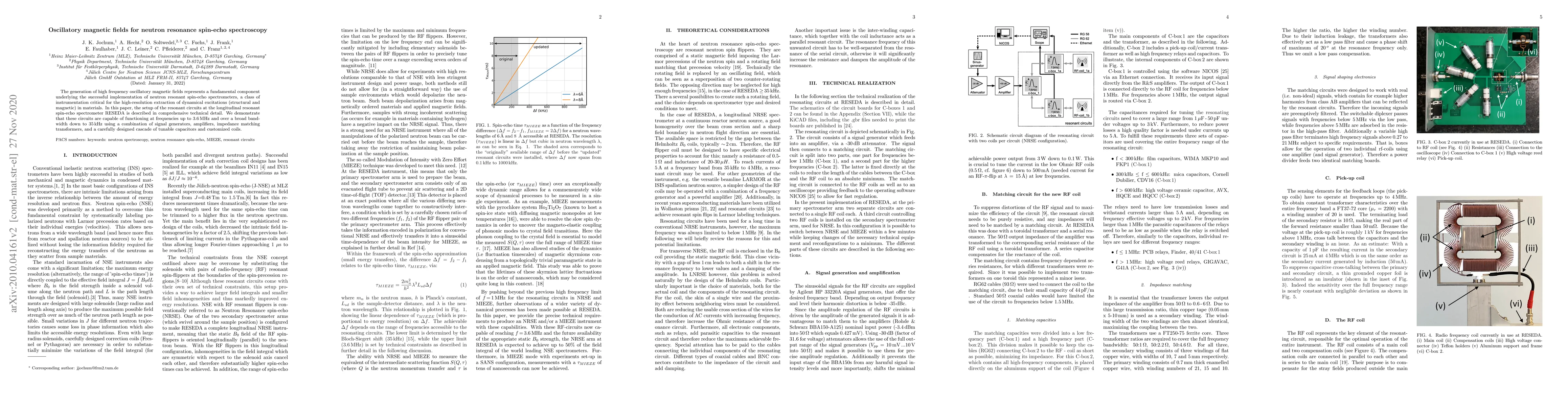 This paper details the technical setup of resonant circuits for a neutron resonant spin-echo spectrometer, demonstrating their capability to generate high-frequency oscillatory magnetic fields up to 3.6 MHz, essential for high-resolution material analysis. The circuits utilize a combination of signal generators, amplifiers, and custom components to achieve broad bandwidth performance.