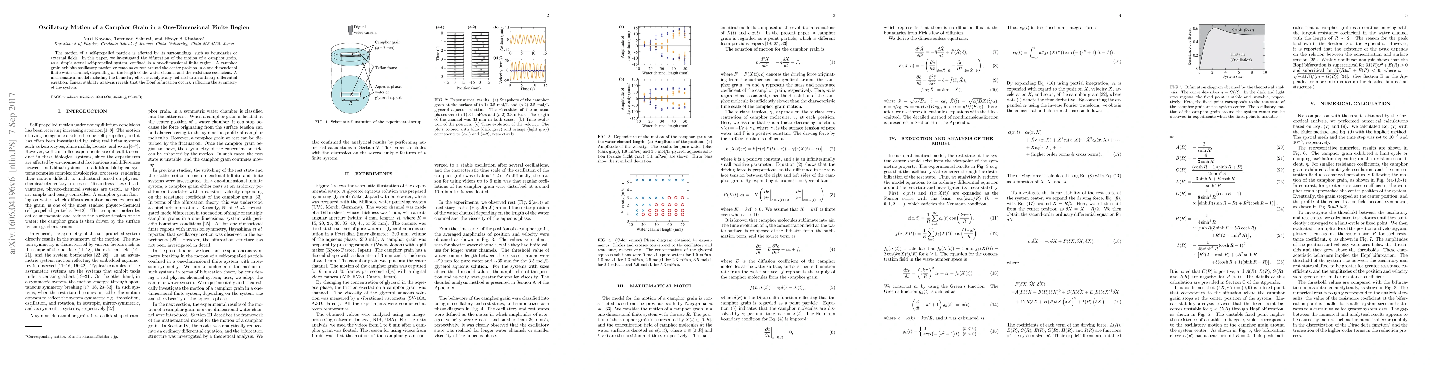 This paper investigates the oscillatory motion of a self-propelled camphor grain in a one-dimensional finite water channel, revealing that its motion depends on channel length and resistance. The study finds a Hopf bifurcation, indicating the system's symmetry and the transition between oscillatory motion and rest.