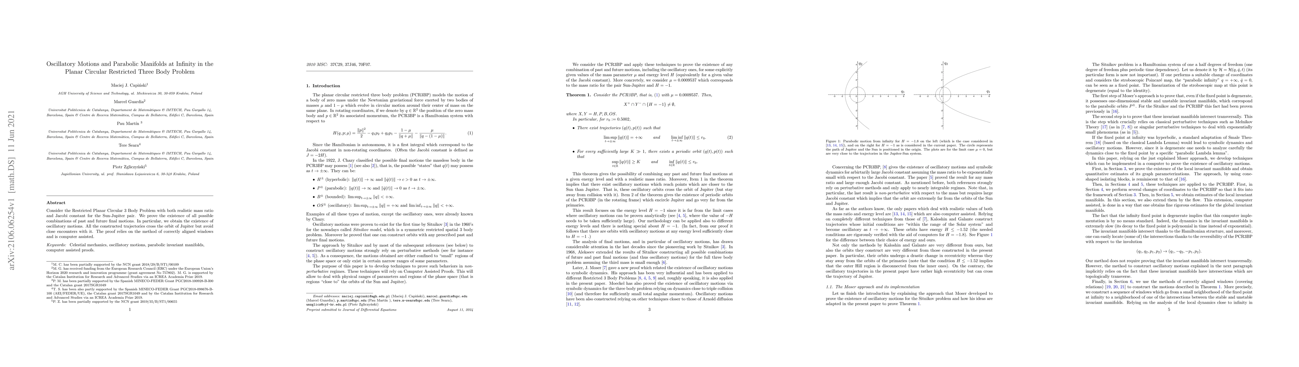 Consider the Restricted Planar Circular 3 Body Problem with both realistic mass ratio and Jacobi constant for the Sun-Jupiter pair. We prove the existence of all possible combinations of past and future final motions. In particular, we obtain the existence of oscillatory motions. All the constructed trajectories cross the orbit of Jupiter but avoid close encounters with it. The proof relies on the method of correctly aligned windows and is computer assisted.
