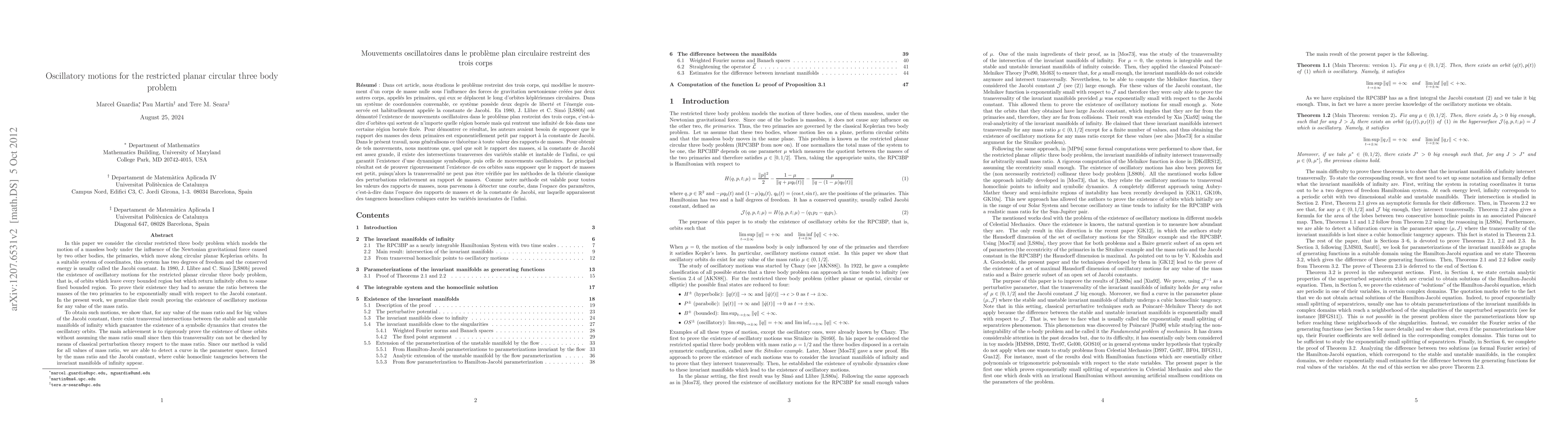 This paper generalizes the existence of oscillatory motions in the restricted planar circular three-body problem, proving such motions for any mass ratio, not just when it is exponentially small. The authors demonstrate the existence of these orbits through transversal intersections between stable and unstable manifolds, revealing a curve in the parameter space where cubic homoclinic tangencies occur.