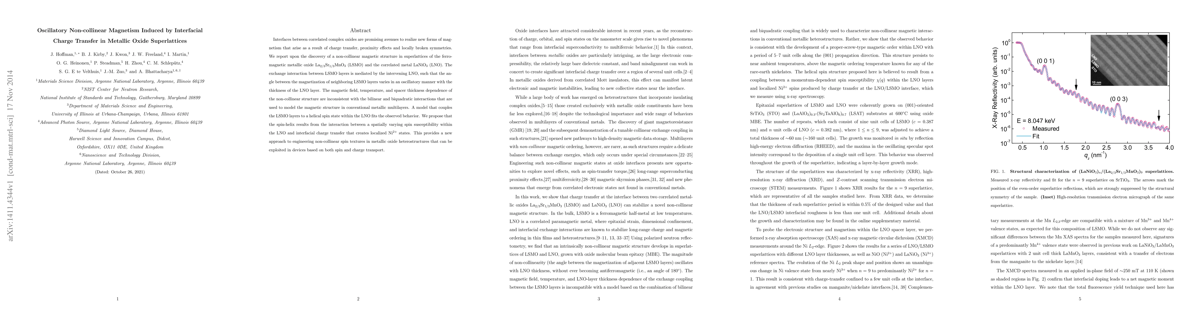 This research discovers oscillatory non-collinear magnetism in metallic oxide superlattices, mediated by interfacial charge transfer between LSMO and LNO layers. The observed behavior, inconsistent with conventional magnetic interactions, suggests a helical spin state in LNO driven by spin susceptibility and localized Ni2+ states, offering a novel method for engineering advanced spin textures.