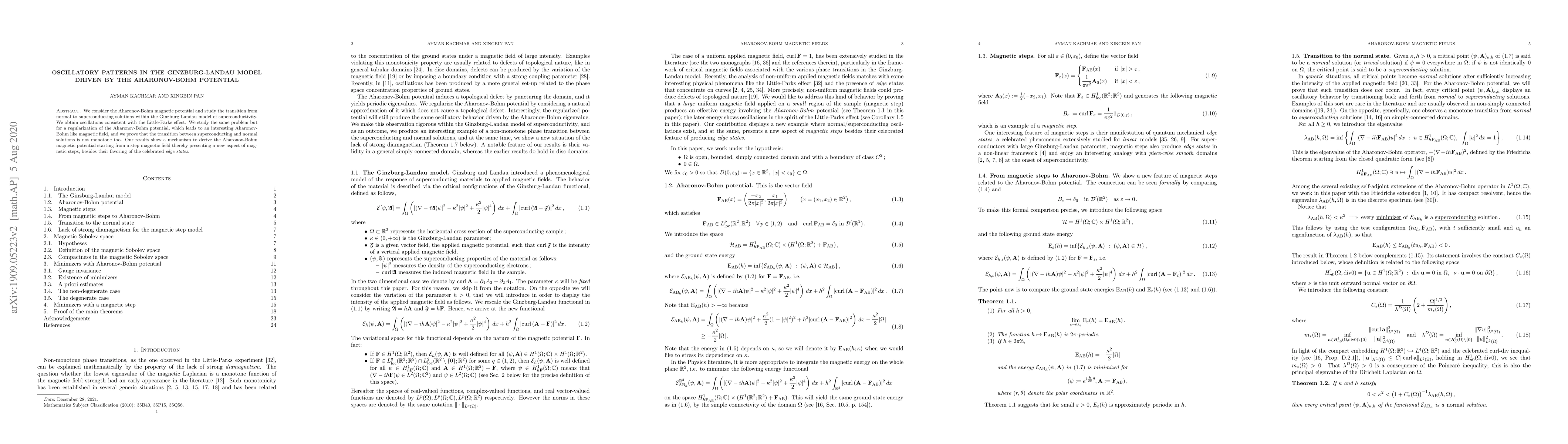 We consider the Aharonov-Bohm magnetic potential and study the transition from normal to superconducting solutions within the Ginzburg-Landau model of superconductivity. We obtain oscillations consistent with the Little-Parks effect. We study the same problem but for a regularization of the Aharonov-Bohm potential, which leads to an interesting Aharonov-Bohm like magnetic field, and we prove that the transition between superconducting and normal solutions is not monotone too. Our results show a mechanism to derive the Aharonov-Bohm magnetic potential starting from a step magnetic field thereby presenting a new aspect of magnetic steps, besides their favoring of the celebrated edge states.