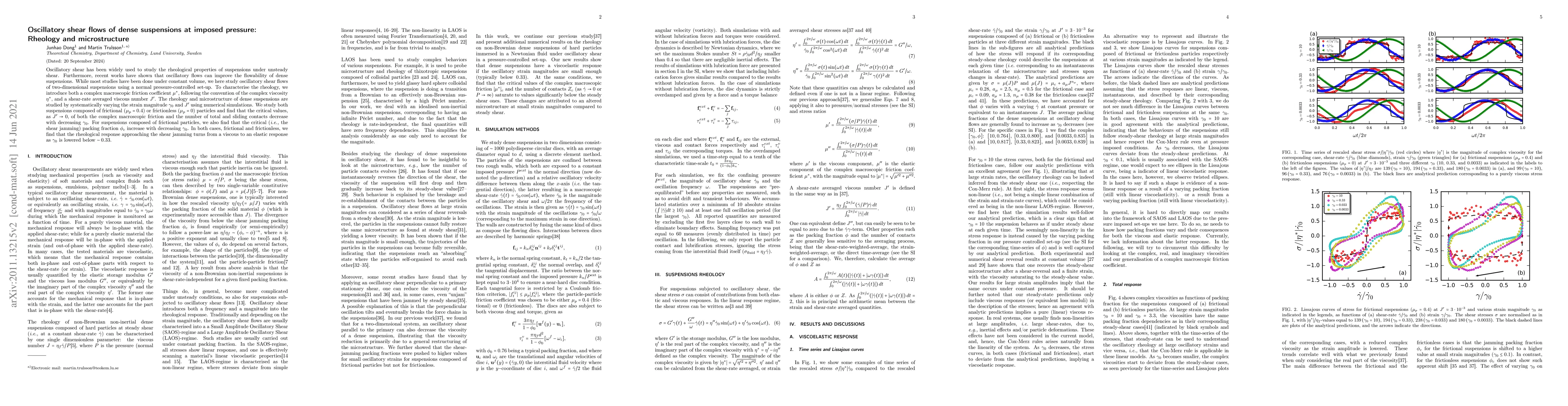 This study investigates the rheology and microstructure of dense suspensions under oscillatory shear flows at controlled pressure. Using numerical simulations, it finds that the critical values for macroscopic friction and particle contacts decrease with lower strain magnitude, and the rheological response shifts from viscous to elastic as the strain magnitude is reduced, especially below ~0.33.