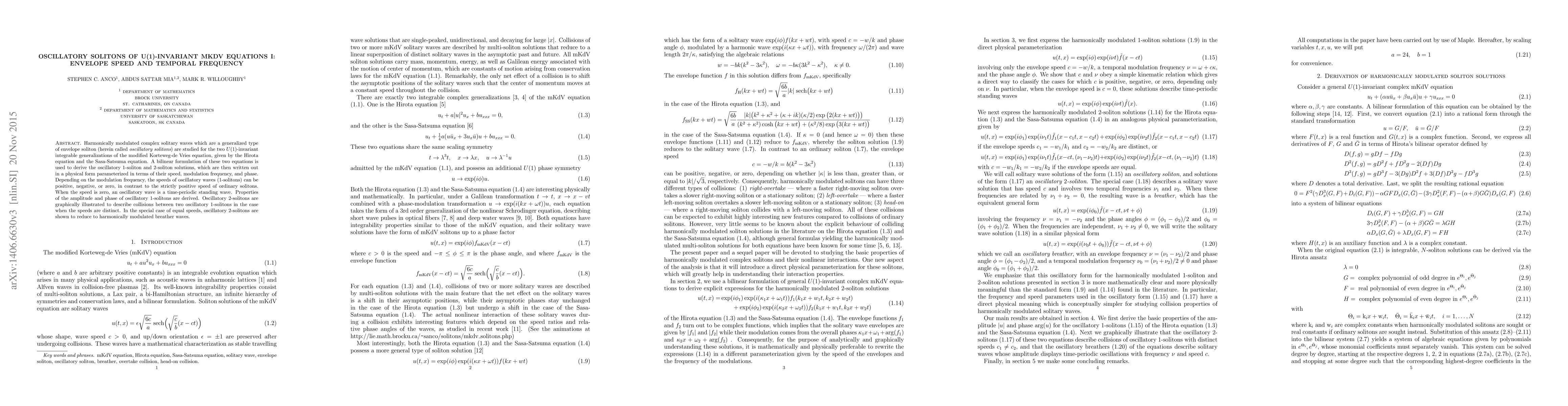 Harmonically modulated complex solitary waves which are a generalized type of envelope soliton (herein coined oscillatory solitons) are studied for the two U(1)-invariant integrable generalizations of the modified Korteweg-de Vries equation, given by the Hirota equation and the Sasa-Satsuma equation. A bilinear formulation of these two equations is used to derive the oscillatory 1-soliton and 2-soliton solutions, which are then written out in a physical form parameterized in terms of their speed, modulation frequency, and phase. Depending on the modulation frequency, the speeds of oscillatory waves (1-solitons) can be positive, negative, or zero, in contrast to the strictly positive speed of ordinary solitons. When the speed is zero, an oscillatory wave is a time-periodic standing wave. Properties of the amplitude and phase of oscillatory 1-solitons are derived. Oscillatory 2-solitons are graphically illustrated to describe collisions between two oscillatory 1-solitons in the case when the speeds are distinct. In the special case of equal speeds, oscillatory 2-solitons are shown to reduce to harmonically modulated breather waves.