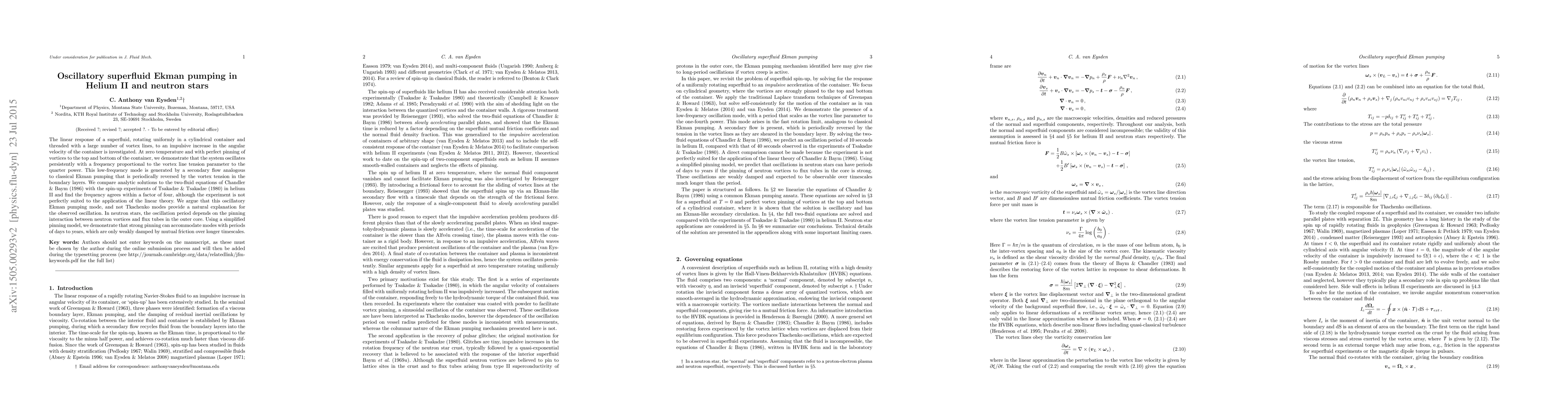 This paper explores the oscillatory superfluid Ekman pumping in rotating superfluids like Helium II and neutron stars, demonstrating a low-frequency oscillation mode driven by vortex tension. The study finds that this mode provides a better explanation for observed oscillations than Tkachenko modes, and in neutron stars, strong pinning interactions can sustain long-period oscillations.