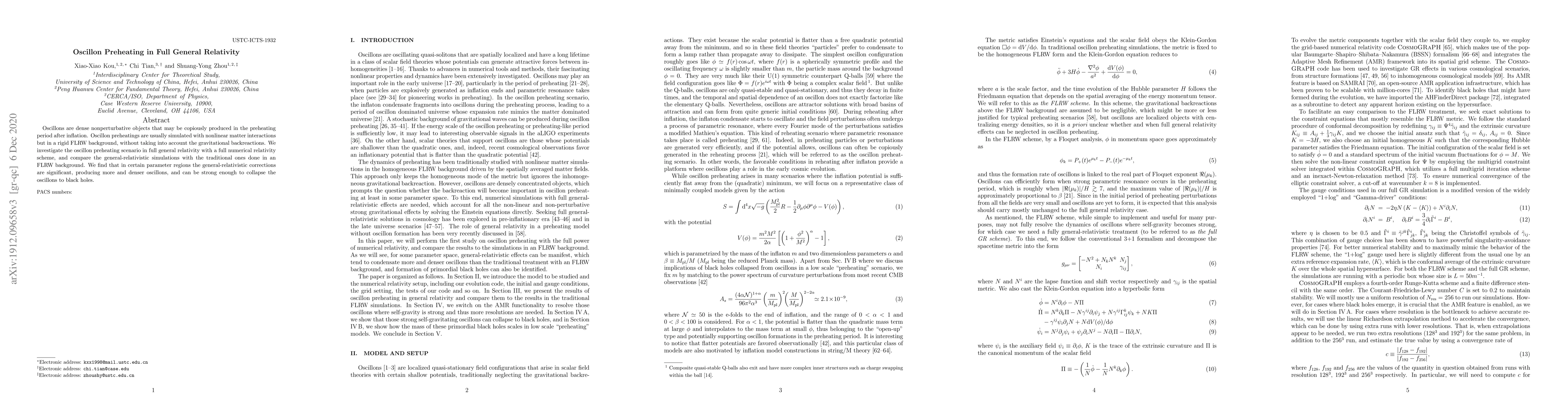 This paper investigates oscillon preheating in full general relativity, finding that general-relativistic corrections can significantly increase oscillon density and lead to their collapse into black holes, contrasting with traditional FLRW background simulations.