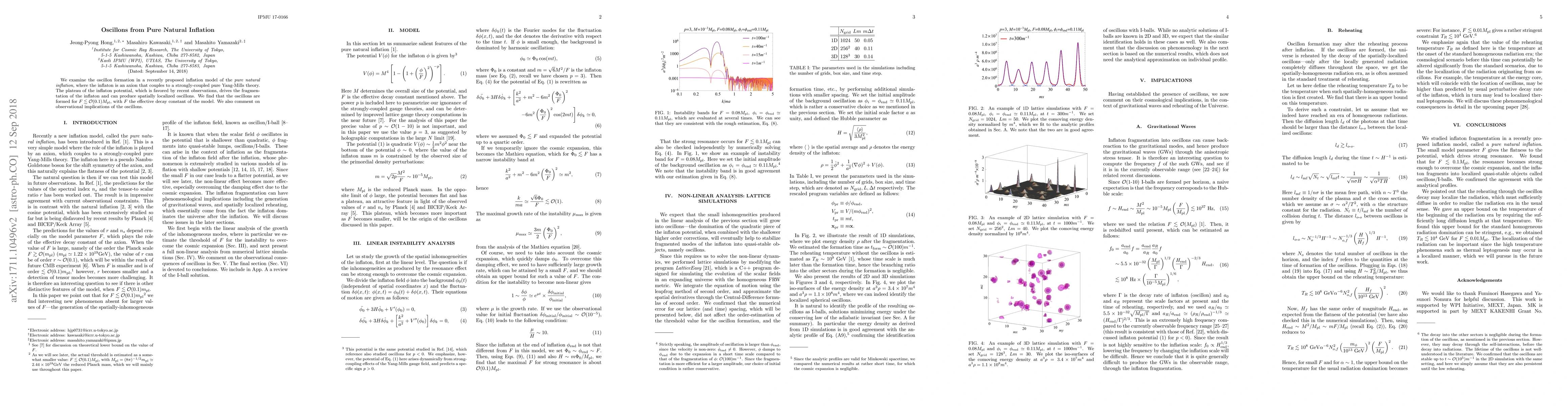 We examine the oscillon formation in a recently proposed inflation model of the pure natural inflation, where the inflaton is an axion that couples to a strongly-coupled pure Yang-Mills theory. The plateau of the inflaton potential, which is favored by recent observations, drives the fragmentation of the inflaton and can produce spatially localized oscillons. We find that the oscillons are formed for F<~ O(0.1) M_{Pl}, with F the effective decay constant of the model. We also comment on observational implications of the oscillons.