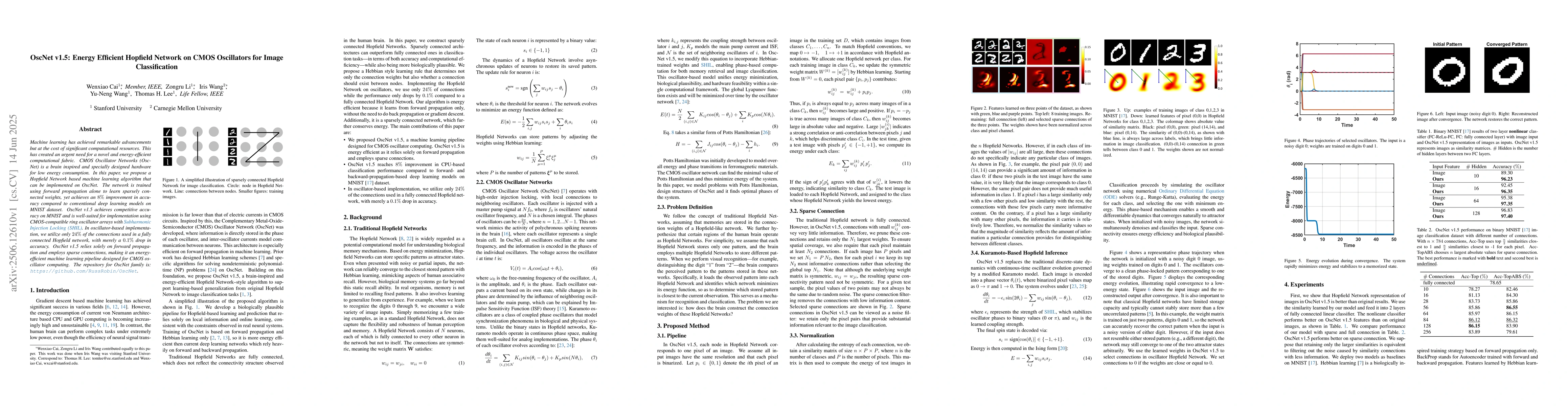 Machine learning has achieved remarkable advancements but at the cost of significant computational resources. This has created an urgent need for a novel and energy-efficient computational fabric. CMOS Oscillator Networks (OscNet) is a brain inspired and specially designed hardware for low energy consumption. In this paper, we propose a Hopfield Network based machine learning algorithm that can be implemented on OscNet. The network is trained using forward propagation alone to learn sparsely connected weights, yet achieves an 8% improvement in accuracy compared to conventional deep learning models on MNIST dataset. OscNet v1.5 achieves competitive accuracy on MNIST and is well-suited for implementation using CMOS-compatible ring oscillator arrays with SHIL. In oscillator-based implementation, we utilize only 24% of the connections used in a fully connected Hopfield network, with merely a 0.1% drop in accuracy. OscNet v1.5 relies solely on forward propagation and employs sparse connections, making it an energy-efficient machine learning pipeline designed for CMOS oscillator computing. The repository for OscNet family is: https://github.com/RussRobin/OscNet.