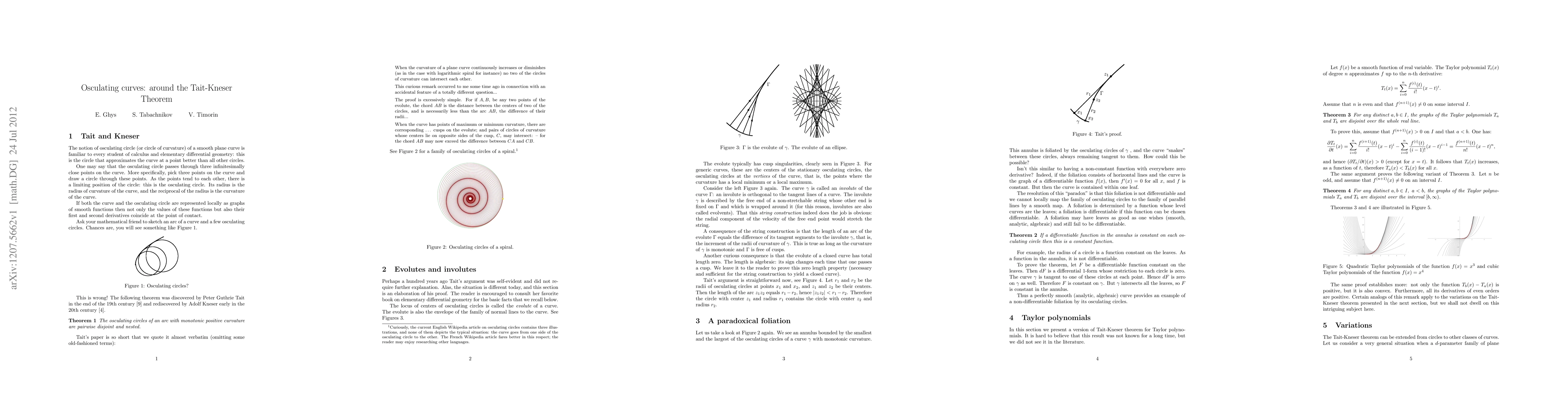Summary: The Tait-Kneser theorem asserts that osculating circles of a plane curve with monotonic curvature are mutually disjoint and nested. This paper explores the theorem and examines several of its variations.