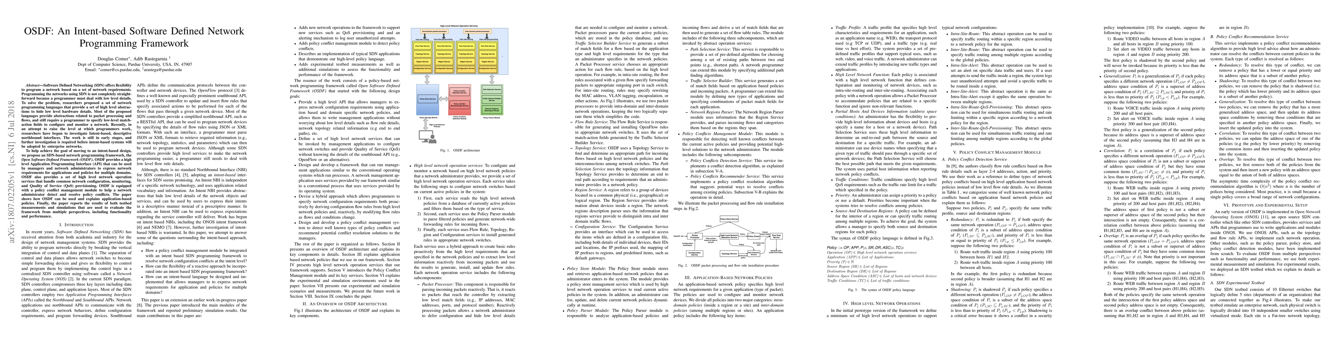 The paper proposes the Open Software Defined Framework (OSDF), an intent-based SDN programming framework that offers high-level APIs for network administrators to express application and policy requirements. It includes services for network configuration, monitoring, and QoS, along with a policy conflict management module, and evaluates its performance through testbed measurements and simulations.