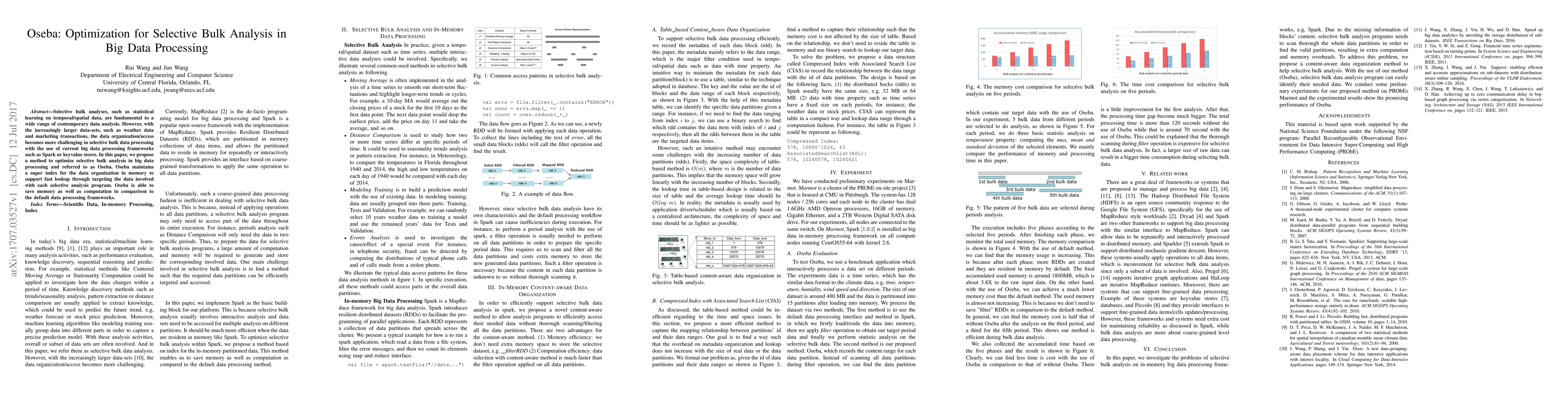 Title: Oseba: Optimization for Selective Bulk Analysis in Big Data Processing Summary: Oseba proposes a method to optimize selective bulk analysis in big data processing by maintaining a super index in memory, significantly reducing memory and computation costs compared to conventional frameworks like Spark.
