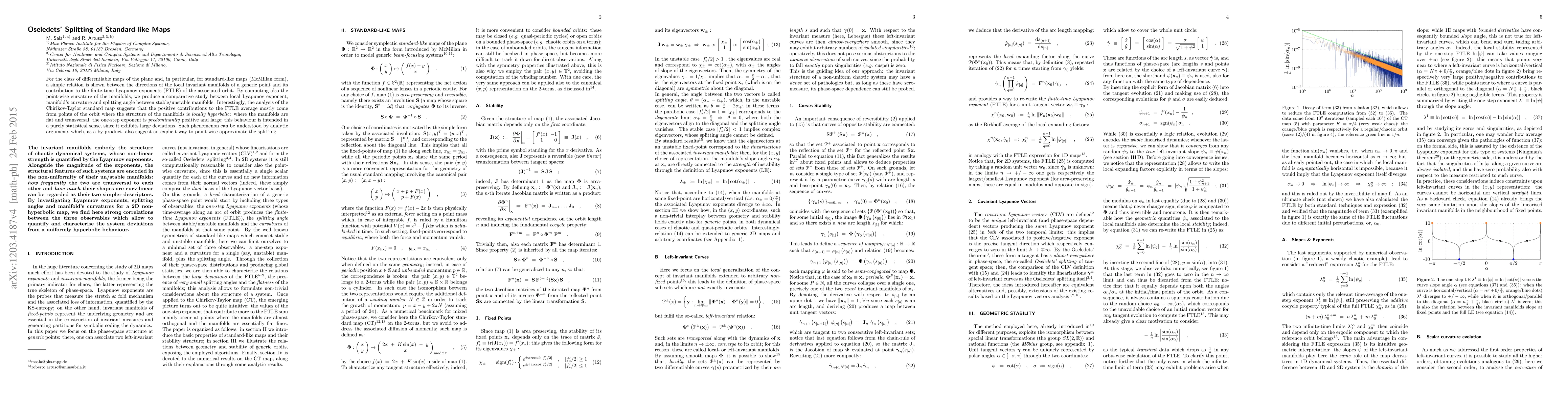 For the class of differentiable maps of the plane and, in particular, for standard-like maps (McMillan form), a simple relation is shown between the directions of the local invariant manifolds of a generic point and its contribution to the finite-time Lyapunov exponents (FTLE) of the associated orbit. By computing also the point-wise curvature of the manifolds, we produce a comparative study between local Lyapunov exponent, manifold's curvature and splitting angle between stable/unstable manifolds. Interestingly, the analysis of the Chirikov-Taylor standard map suggests that the positive contributions to the FTLE average mostly come from points of the orbit where the structure of the manifolds is locally hyperbolic: where the manifolds are flat and transversal, the one-step exponent is predominantly positive and large; this behaviour is intended in a purely statistical sense, since it exhibits large deviations. Such phenomenon can be understood by analytic arguments which, as a by-product, also suggest an explicit way to point-wise approximate the splitting.