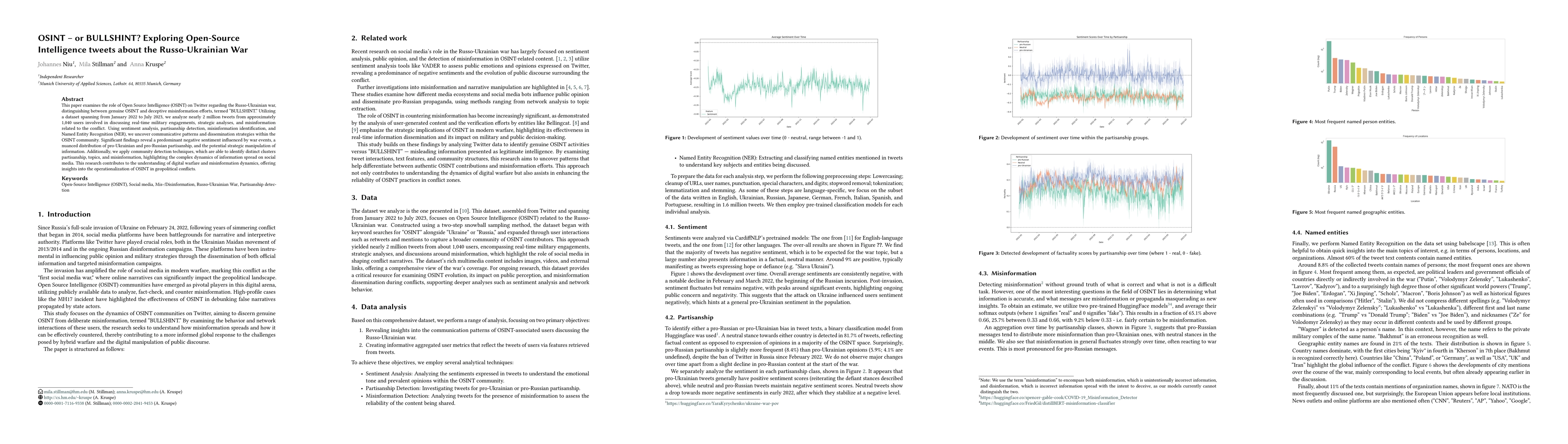This paper examines the role of Open Source Intelligence (OSINT) on Twitter regarding the Russo-Ukrainian war, distinguishing between genuine OSINT and deceptive misinformation efforts, termed "BULLSHINT." Utilizing a dataset spanning from January 2022 to July 2023, we analyze nearly 2 million tweets from approximately 1,040 users involved in discussing real-time military engagements, strategic analyses, and misinformation related to the conflict. Using sentiment analysis, partisanship detection, misinformation identification, and Named Entity Recognition (NER), we uncover communicative patterns and dissemination strategies within the OSINT community. Significant findings reveal a predominant negative sentiment influenced by war events, a nuanced distribution of pro-Ukrainian and pro-Russian partisanship, and the potential strategic manipulation of information. Additionally, we apply community detection techniques, which are able to identify distinct clusters partisanship, topics, and misinformation, highlighting the complex dynamics of information spread on social media. This research contributes to the understanding of digital warfare and misinformation dynamics, offering insights into the operationalization of OSINT in geopolitical conflicts.