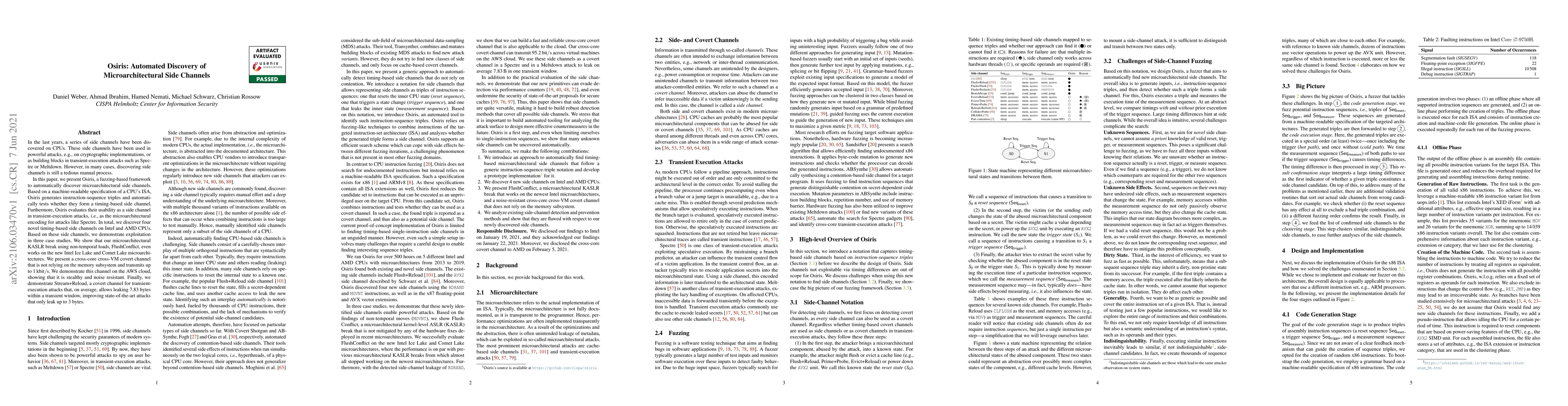 This paper introduces Osiris, a fuzzing-based framework for automating the discovery of microarchitectural side channels in CPUs. Osiris generates instruction sequences and tests for timing-based side channels, discovering four new ones and demonstrating their exploitation in various attacks, including a covert channel on AWS and an improved transient-execution attack.