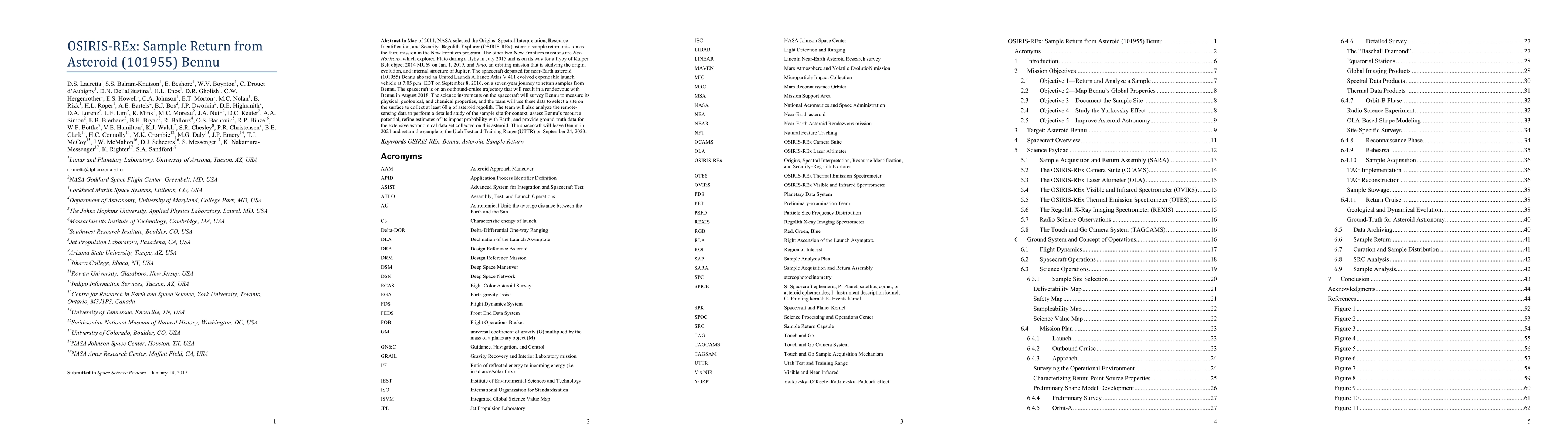In May of 2011, NASA selected the Origins, Spectral Interpretation, Resource Identification, and Security-Regolith Explorer (OSIRIS-REx) asteroid sample return mission as the third mission in the New Frontiers program. The other two New Frontiers missions are New Horizons, which explored Pluto during a flyby in July 2015 and is on its way for a flyby of Kuiper Belt object 2014 MU69 on Jan. 1, 2019, and Juno, an orbiting mission that is studying the origin, evolution, and internal structure of Jupiter. The spacecraft departed for near-Earth asteroid (101955) Bennu aboard an United Launch Alliance Atlas V 411 evolved expendable launch vehicle at 7:05 p.m. EDT on September 8, 2016, on a seven-year journey to return samples from Bennu. The spacecraft is on an outbound-cruise trajectory that will result in a rendezvous with Bennu in August 2018. The science instruments on the spacecraft will survey Bennu to measure its physical, geological, and chemical properties, and the team will use these data to select a site on the surface to collect at least 60 g of asteroid regolith. The team will also analyze the remote-sensing data to perform a detailed study of the sample site for context, assess Bennus resource potential, refine estimates of its impact probability with Earth, and provide ground-truth data for the extensive astronomical data set collected on this asteroid. The spacecraft will leave Bennu in 2021 and return the sample to the Utah Test and Training Range (UTTR) on September 24, 2023.