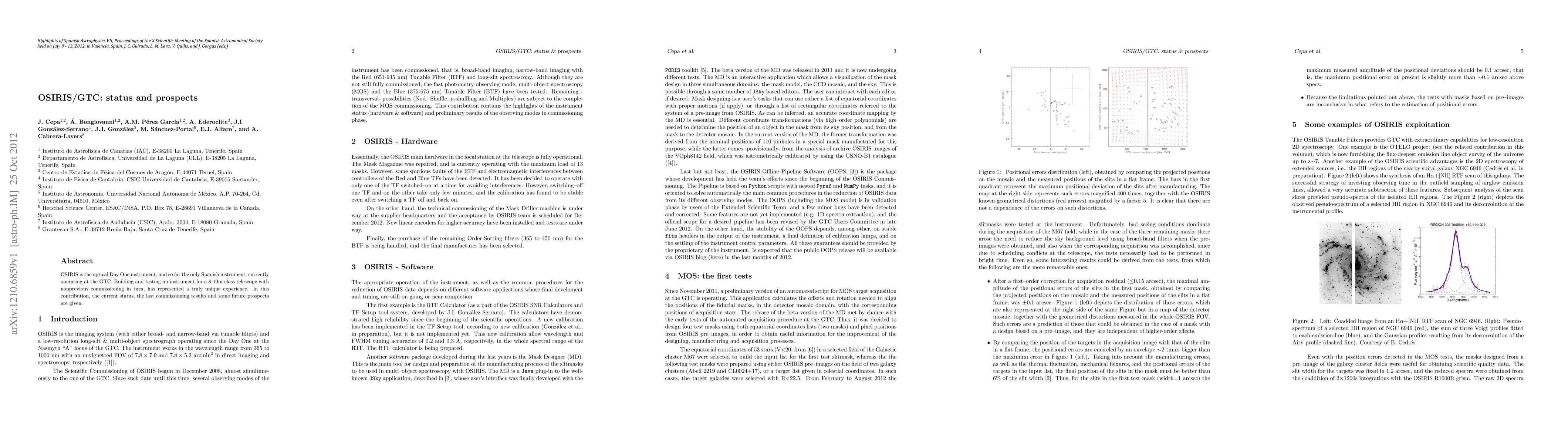 **Summary:** OSIRIS, the sole Spanish instrument on the GTC, shares its first commissioning results and ongoing operations, highlighting unique challenges and achievements in developing for a large telescope. Future prospects and improvements are also discussed.