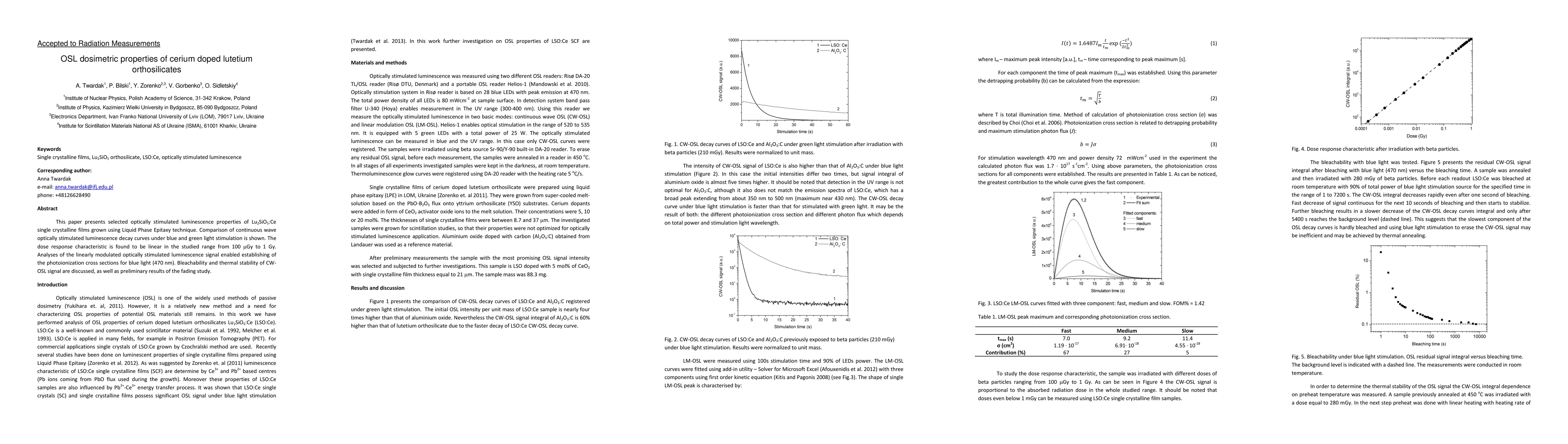 This paper investigates the optically stimulated luminescence (OSL) properties of cerium-doped lutetium orthosilicate (Lu2SiO5:Ce) single crystalline films, finding a linear dose response from 100 uGy to 1 Gy. The study also examines the bleachability, thermal stability, and fading characteristics of the OSL signal under blue and green light stimulation.