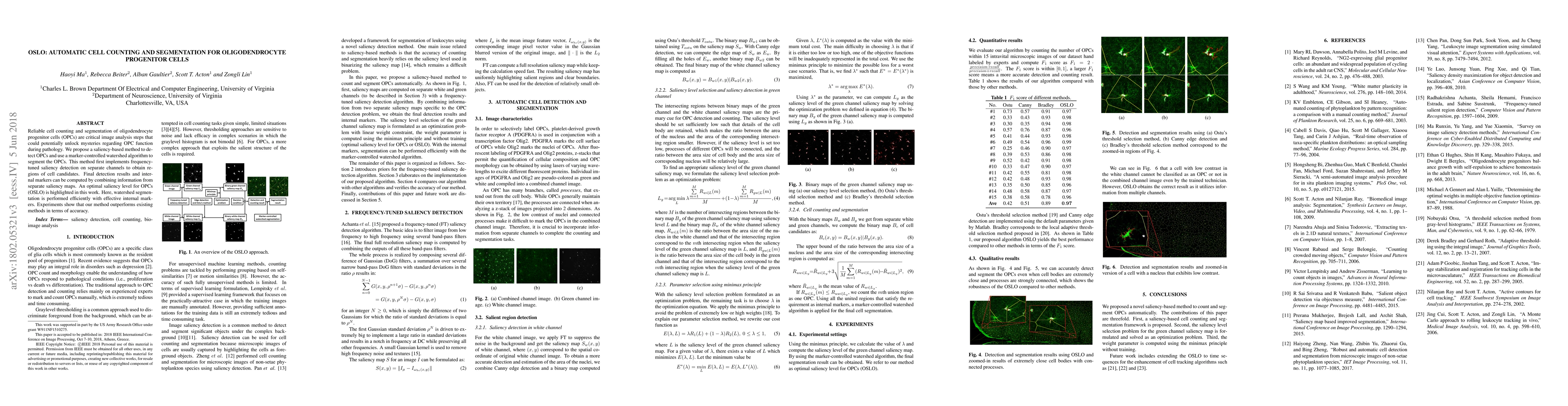 The paper proposes a saliency-based method named OSLO for automatic detection and segmentation of oligodendrocyte progenitor cells (OPCs) using frequency-tuned saliency detection and marker-controlled watershed segmentation, demonstrating superior accuracy over existing techniques.