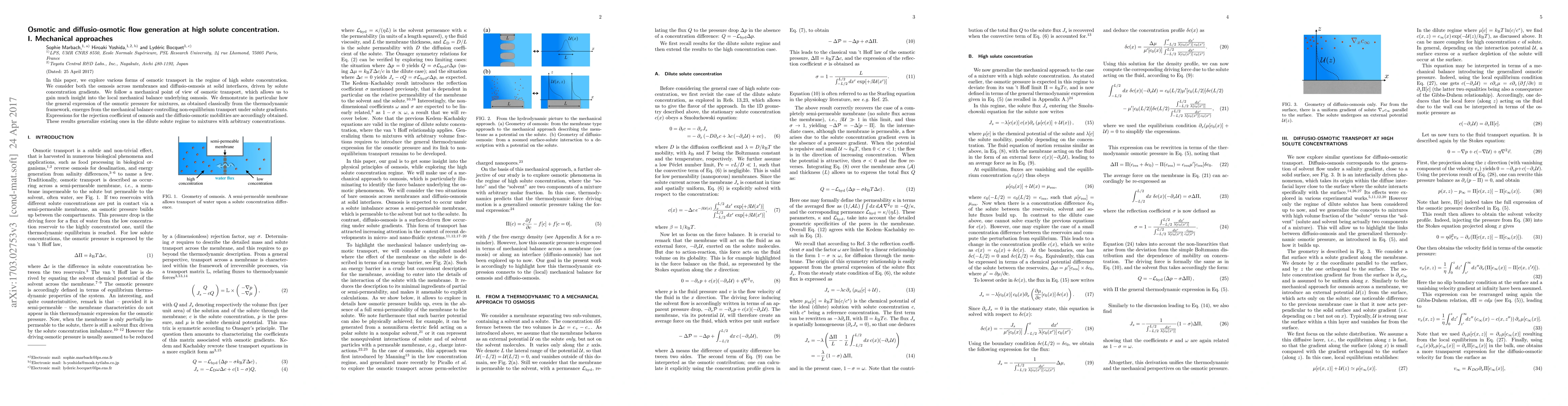 This paper investigates osmotic transport mechanisms at high solute concentrations, focusing on the mechanical balance underlying osmosis and diffusio-osmosis. It derives expressions for osmotic pressure, rejection coefficient, and diffusio-osmotic mobilities, extending classical dilute solute models to mixtures with arbitrary concentrations.