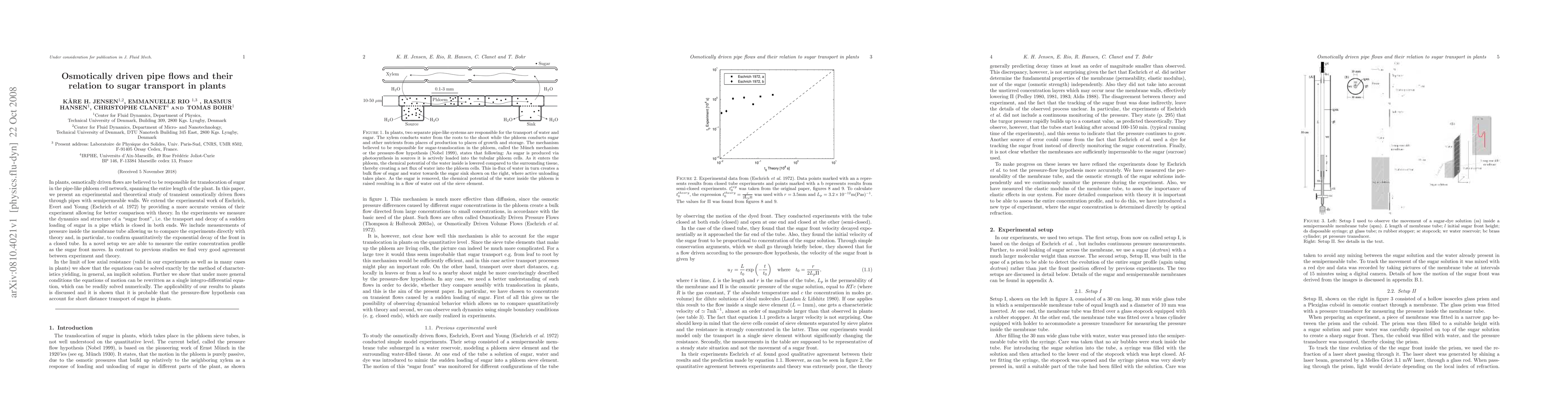This paper presents an experimental and theoretical study on osmotically driven flows in pipes, focusing on sugar transport in plant phloem. The study confirms the exponential decay of sugar fronts in closed tubes and shows good agreement between experimental measurements and theoretical models, supporting the pressure-flow hypothesis for short-distance sugar transport in plants.