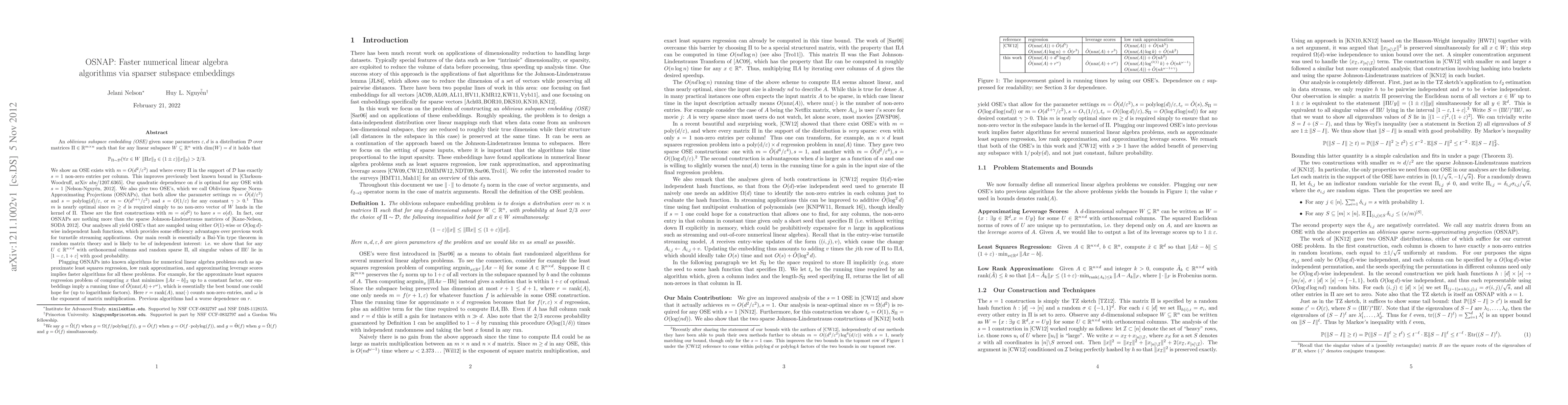 An "oblivious subspace embedding (OSE)" given some parameters eps,d is a distribution D over matrices B in R^{m x n} such that for any linear subspace W in R^n with dim(W) = d it holds that Pr_{B ~ D}(forall x in W ||B x||_2 in (1 +/- eps)||x||_2) > 2/3 We show an OSE exists with m = O(d^2/eps^2) and where every B in the support of D has exactly s=1 non-zero entries per column. This improves previously best known bound in [Clarkson-Woodruff, arXiv:1207.6365]. Our quadratic dependence on d is optimal for any OSE with s=1 [Nelson-Nguyen, 2012]. We also give two OSE's, which we call Oblivious Sparse Norm-Approximating Projections (OSNAPs), that both allow the parameter settings m = \~O(d/eps^2) and s = polylog(d)/eps, or m = O(d^{1+gamma}/eps^2) and s=O(1/eps) for any constant gamma>0. This m is nearly optimal since m >= d is required simply to no non-zero vector of W lands in the kernel of B. These are the first constructions with m=o(d^2) to have s=o(d). In fact, our OSNAPs are nothing more than the sparse Johnson-Lindenstrauss matrices of [Kane-Nelson, SODA 2012]. Our analyses all yield OSE's that are sampled using either O(1)-wise or O(log d)-wise independent hash functions, which provides some efficiency advantages over previous work for turnstile streaming applications. Our main result is essentially a Bai-Yin type theorem in random matrix theory and is likely to be of independent interest: i.e. we show that for any U in R^{n x d} with orthonormal columns and random sparse B, all singular values of BU lie in [1-eps, 1+eps] with good probability. Plugging OSNAPs into known algorithms for numerical linear algebra problems such as approximate least squares regression, low rank approximation, and approximating leverage scores implies faster algorithms for all these problems.