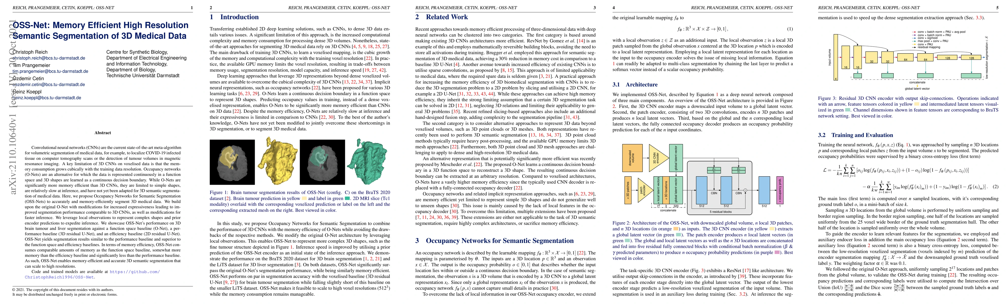 OSS-Net proposes an efficient alternative to 3D CNNs for high-resolution semantic segmentation of medical data, achieving comparable accuracy while significantly reducing memory consumption. It leverages occupancy networks and local observations for enhanced performance and faster inference.