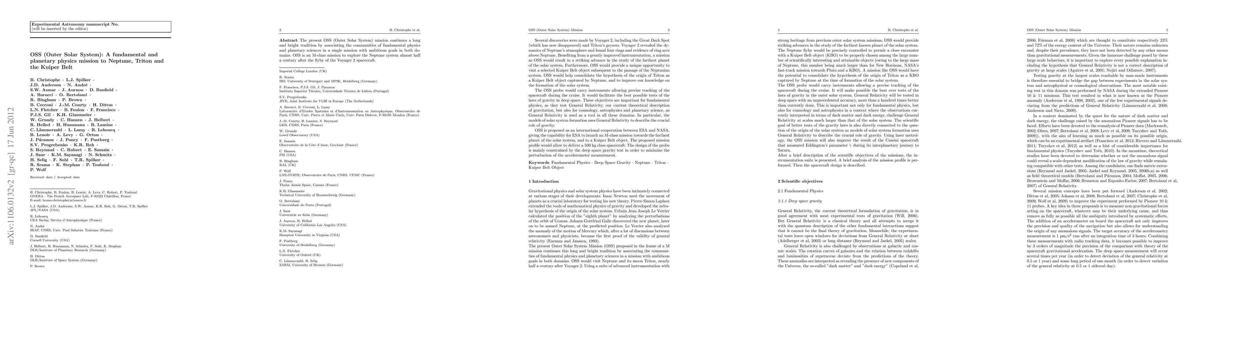 The OSS mission aims to explore Neptune, Triton, and a Kuiper Belt object, combining fundamental physics and planetary science goals. It seeks to advance knowledge of Neptune's atmosphere and rings, test General Relativity in deep space, and investigate Triton's origin, all within an international cooperation between ESA and NASA.